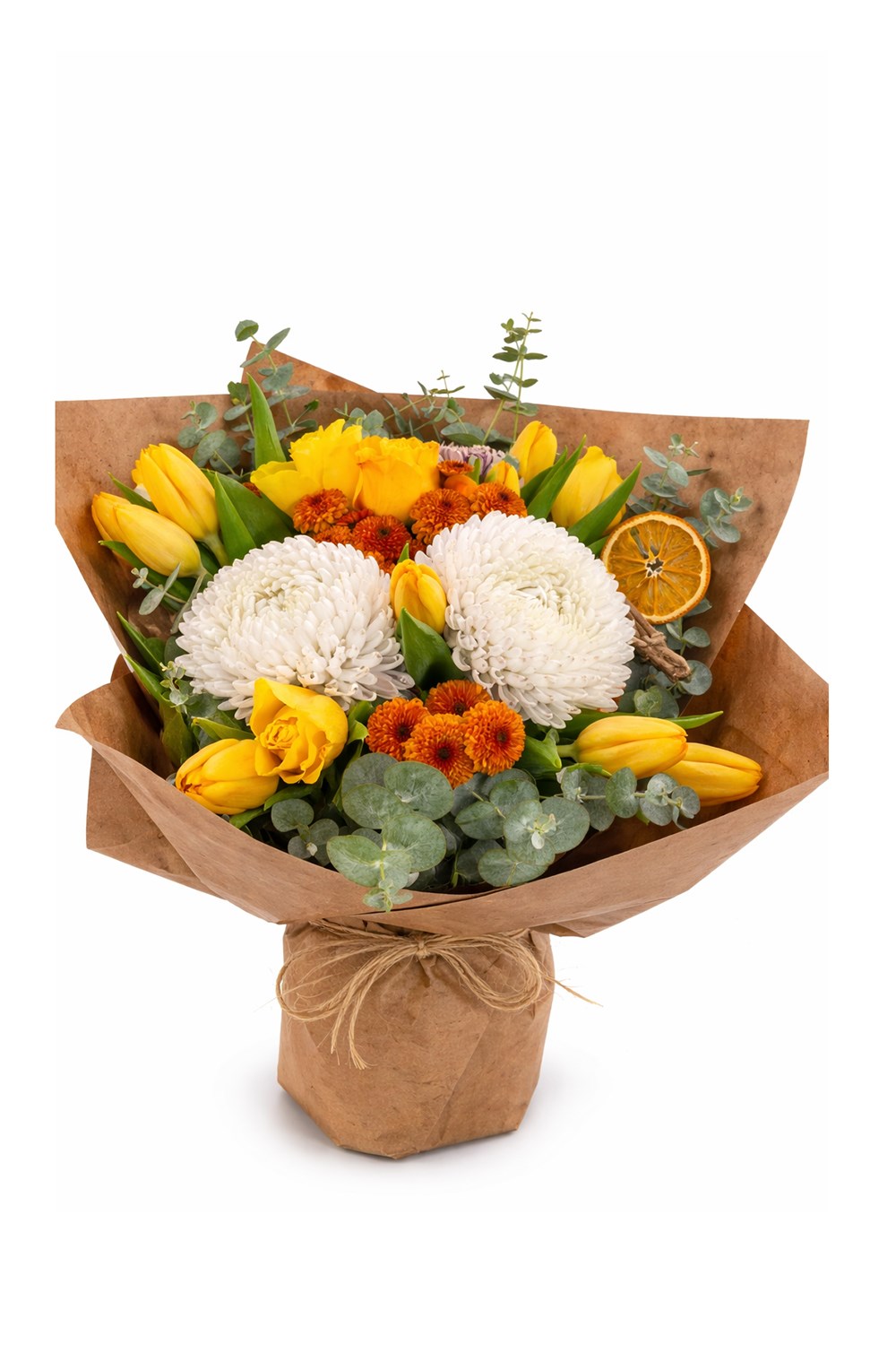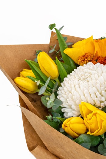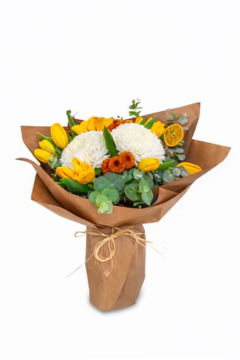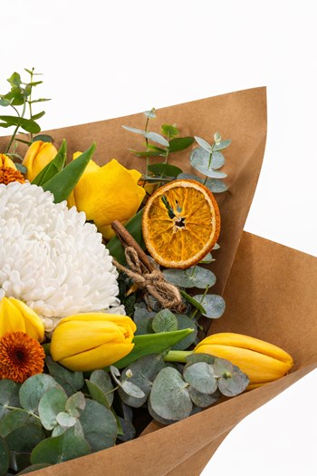 Signature Bouquet, sarı lalelerin enerjisini, beyaz krizantemin zarafetiyle buluşturan modern bir Punica tasarımıdır. Turuncu çiçek detayları ve kurutulmuş portakal dokunuşu ile kompozisyona sofistike bir karakter kazandırılmıştır.