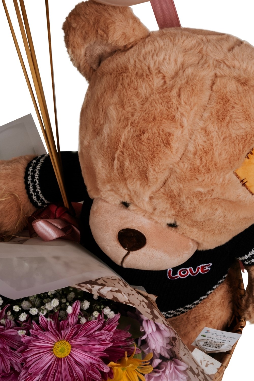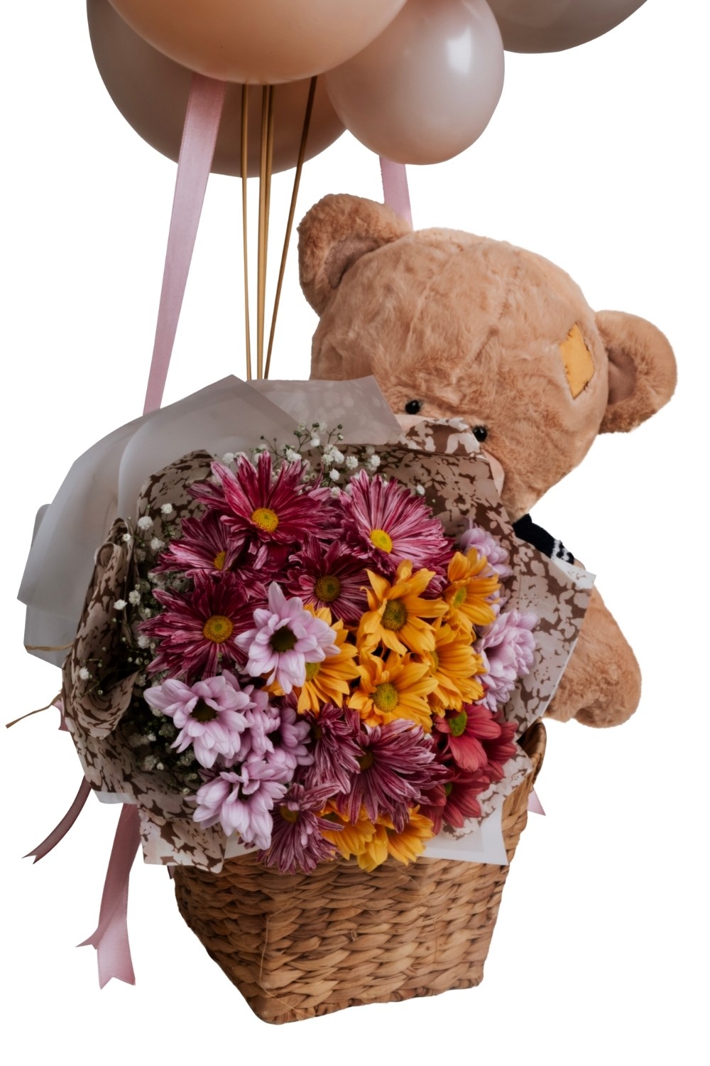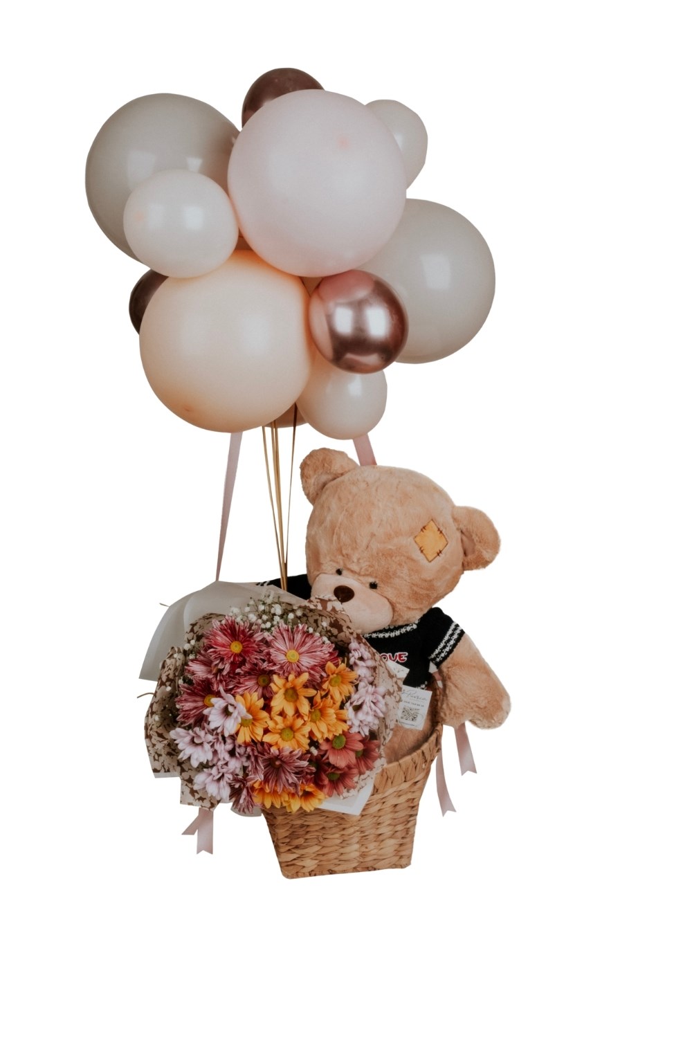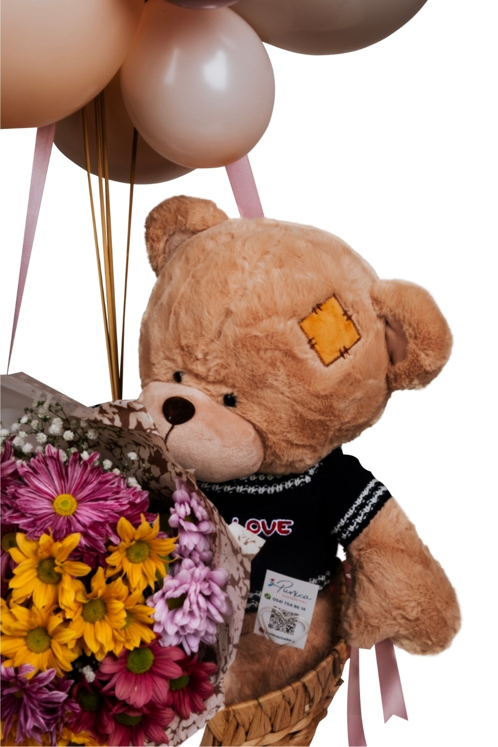 Balonlu Ayıcık & Çiçek Sepeti; pastel