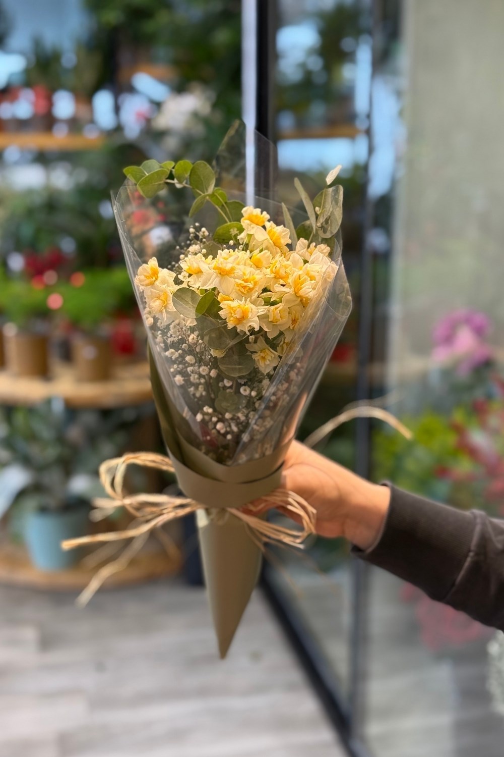 Bu buket; 10 dal taze nergis, zarif cipso dokunuşları ve ferahlatıcı okaliptus yaprakları ile dengeli ve doğal bir kompozisyon oluşturur.