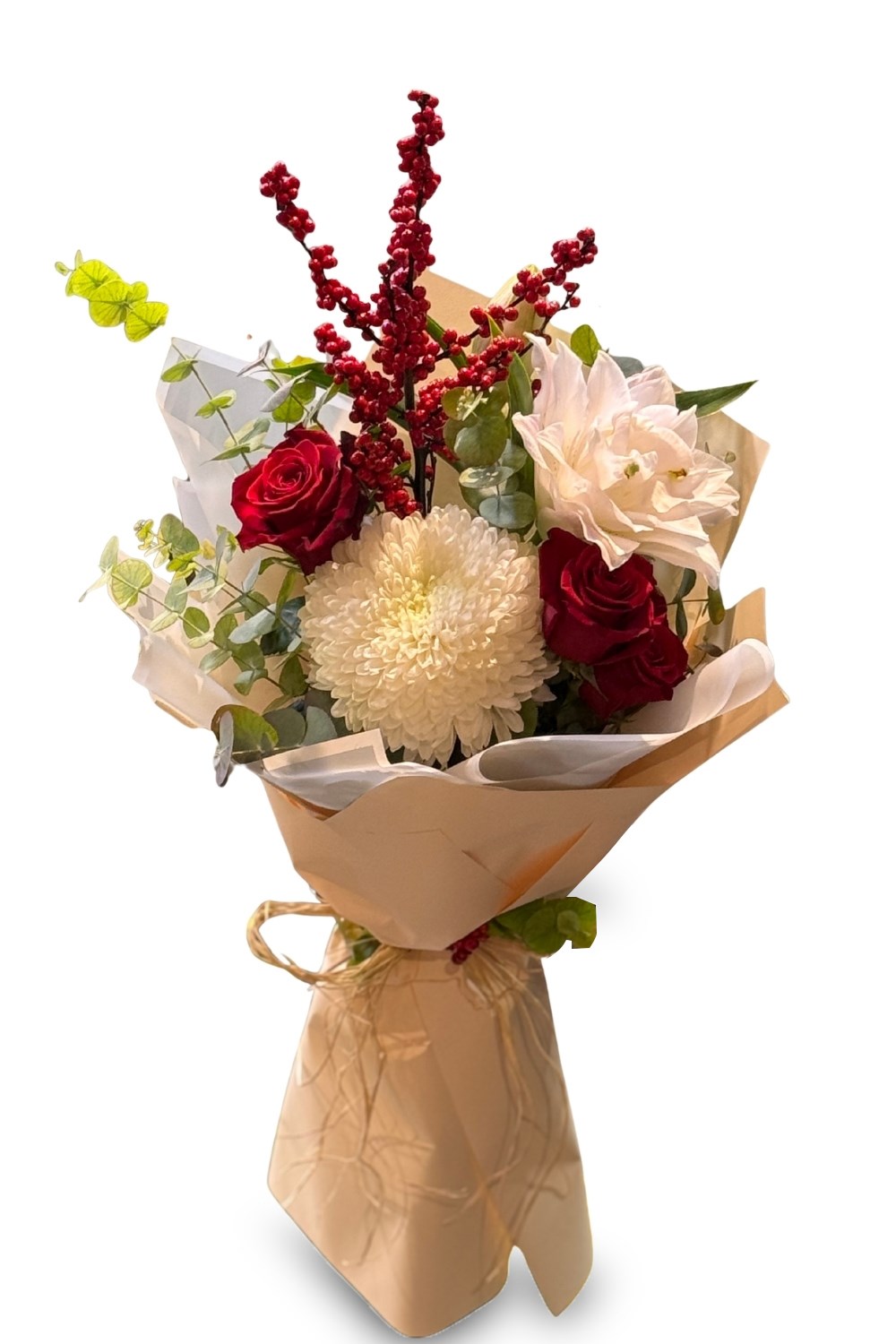Kırmızı güllerin güçlü ve tutkulu duruşu, beyaz krizantemin zarafeti ve mevsim çiçeklerinin doğal uyumuyla hazırlanan bu özel tasarım buket; duygularınızı en şık haliyle ifade etmeniz için tasarlandı.