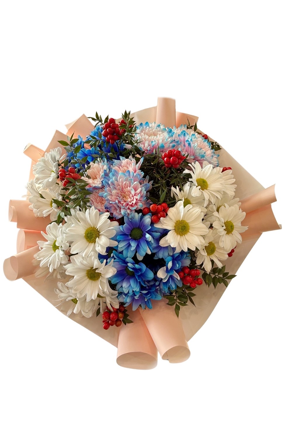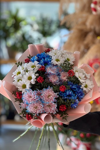 Pastel mavi ve pembe tonlarında krizantemler, beyaz papatyalar ve yılbaşı ruhunu yansıtan kokina dallarıyla hazırlanan bu özel buket; zarif, dengeli ve göz alıcı bir görünüm sunar.