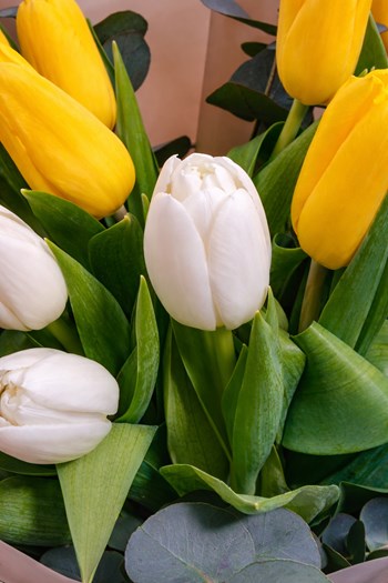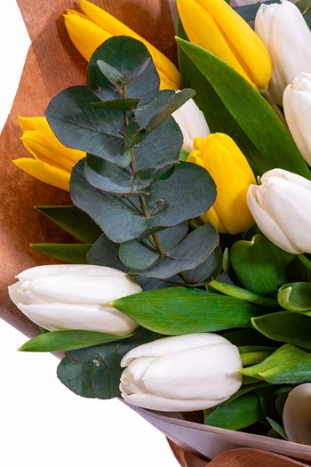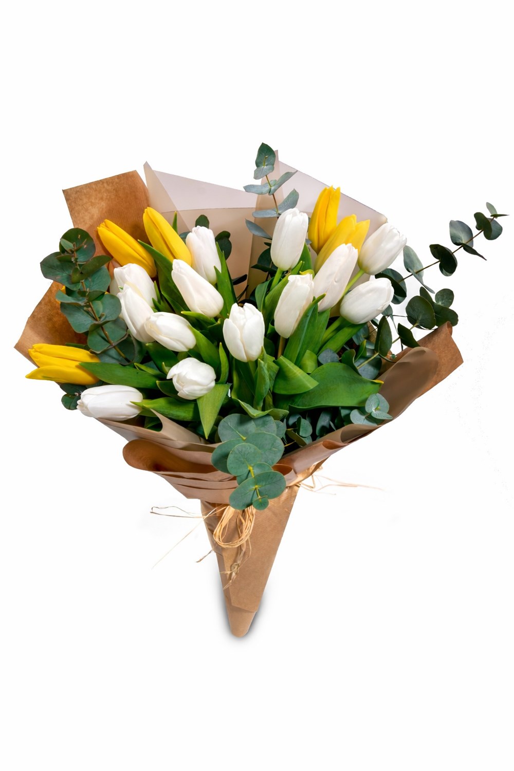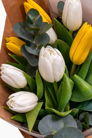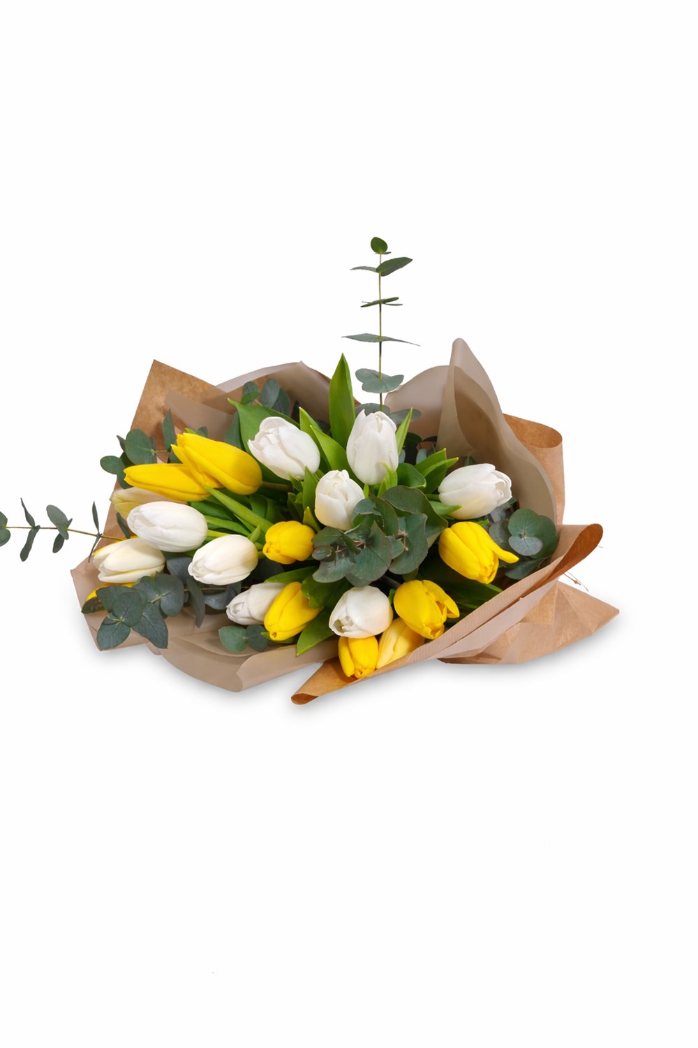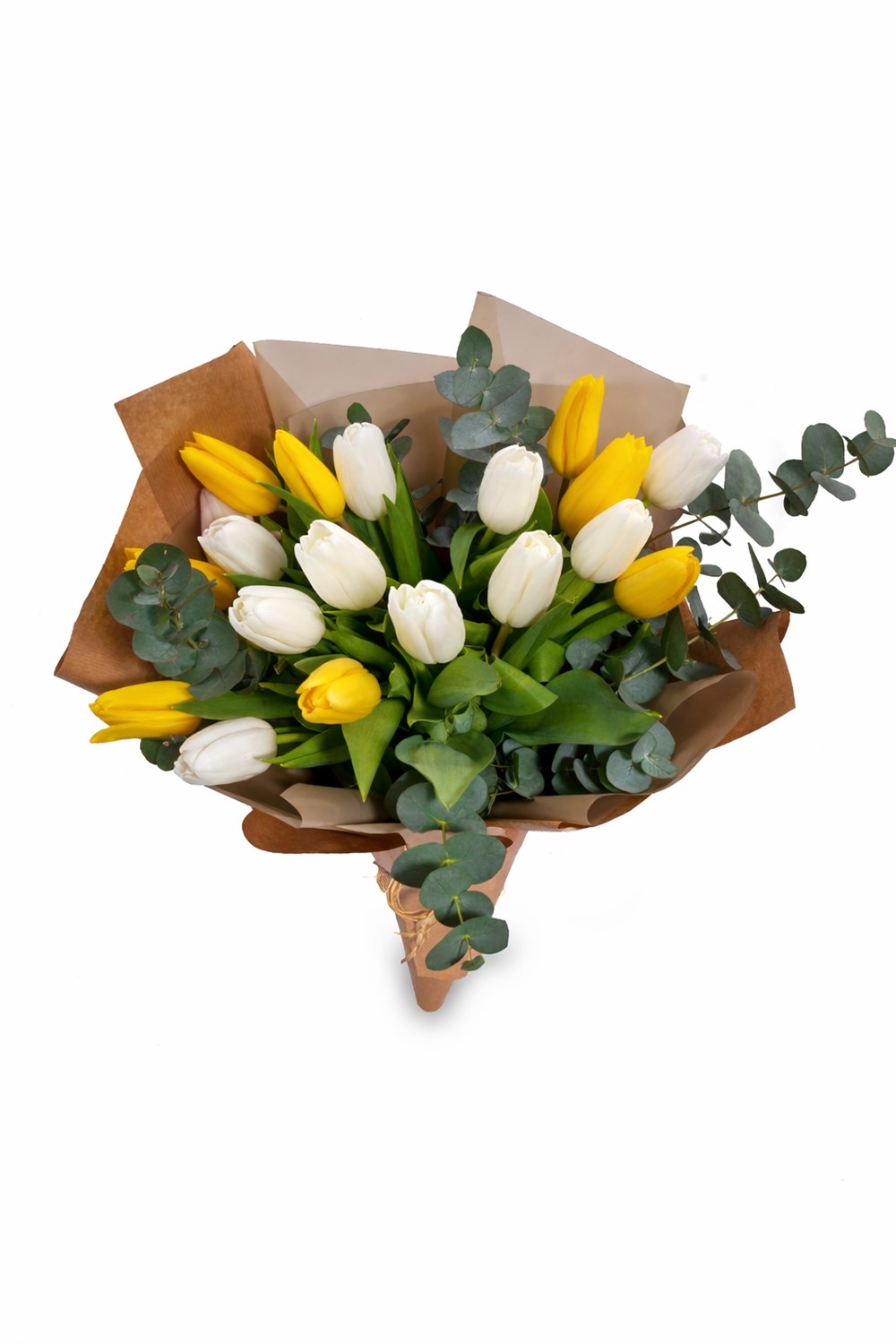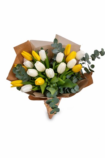 Bu buket, 18 adet taze sarı ve beyaz lale ile hazırlanmıştır.