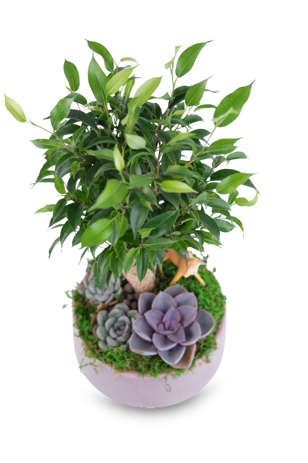 Doğal moss, minyatür geyik figürü ve Ficus bonsai ağacıyla hazırlanan özel mini orman aranjmanı. Hem ofise hem hediye için ideal.