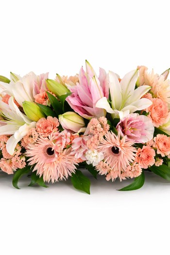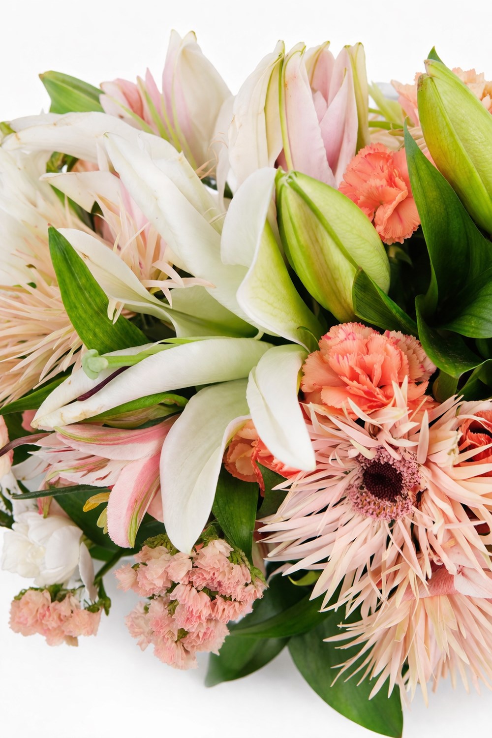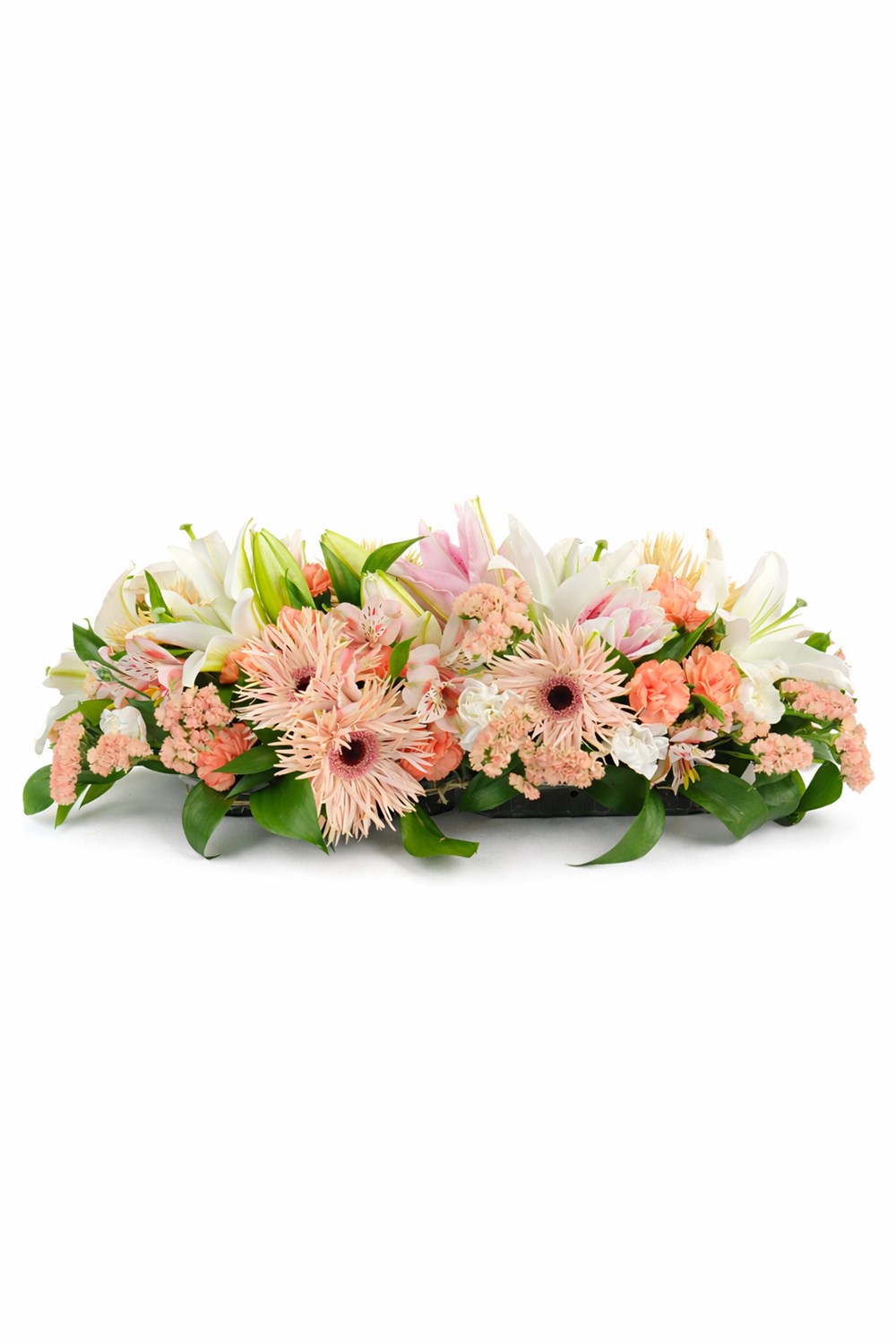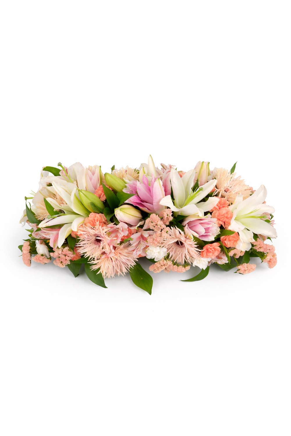Lilyum, gerbera ve soft tonlardaki çiçeklerin uyumuyla hazırlanan bu aranjman, özellikle nikah masası ve davet alanları için ideal bir dekoratif çözümdür.