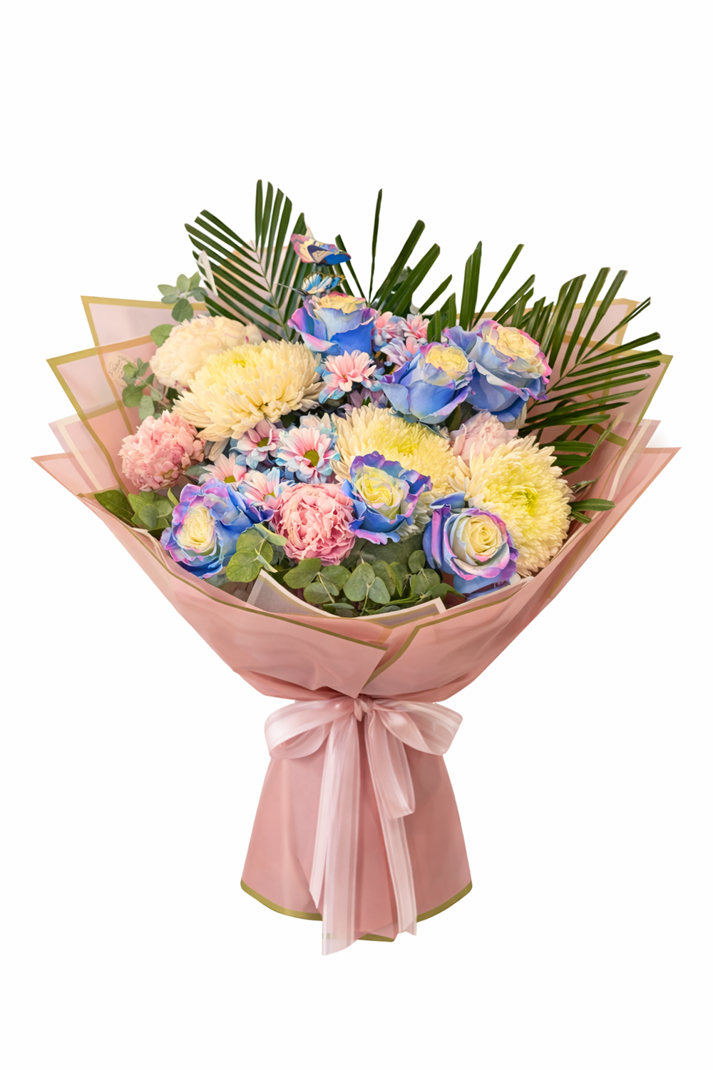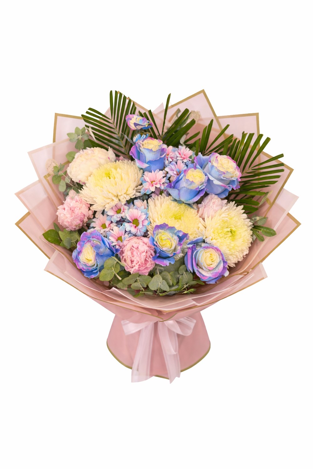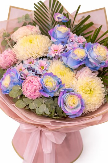 Pastel tonlarda renklendirilmiş güller, krizantem ve tamamlayıcı çiçeklerle hazırlanan bu özel buket;