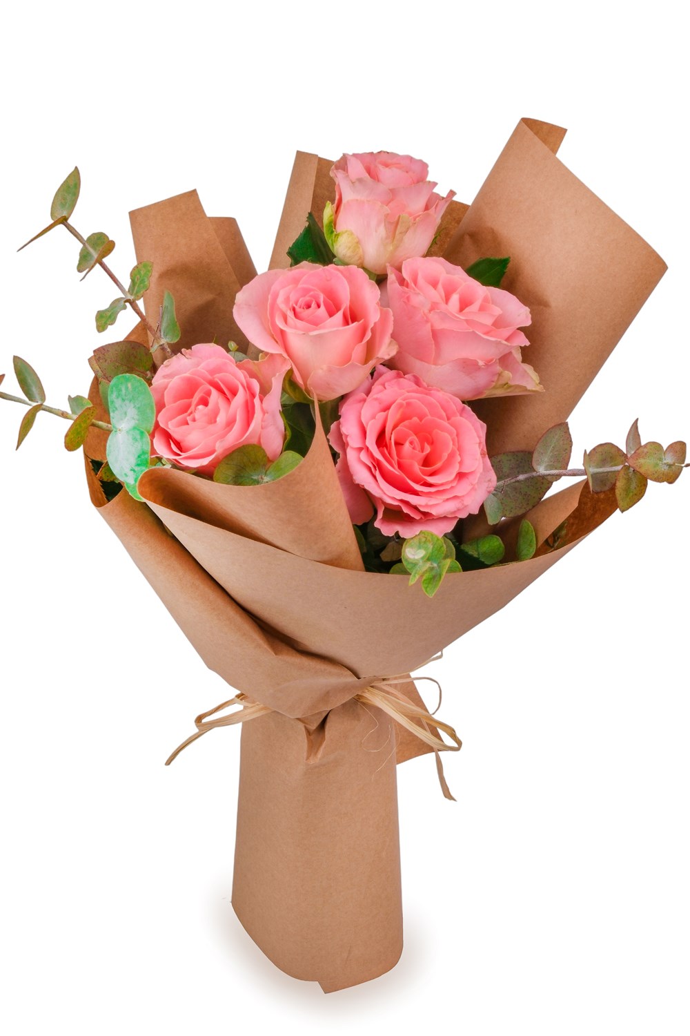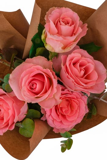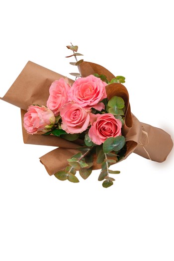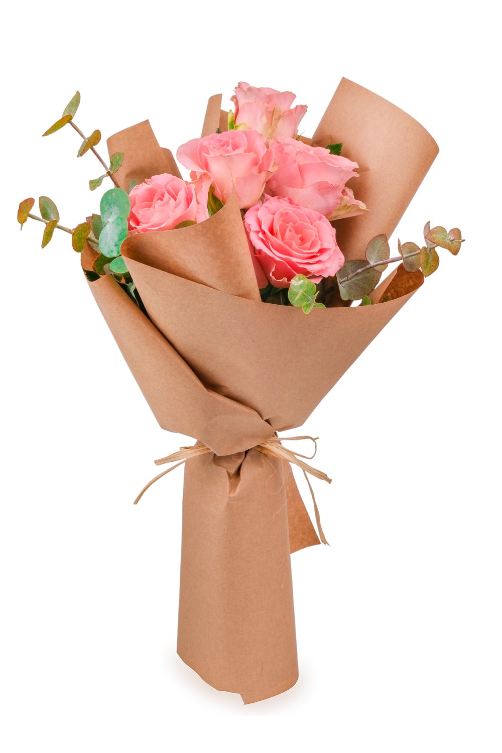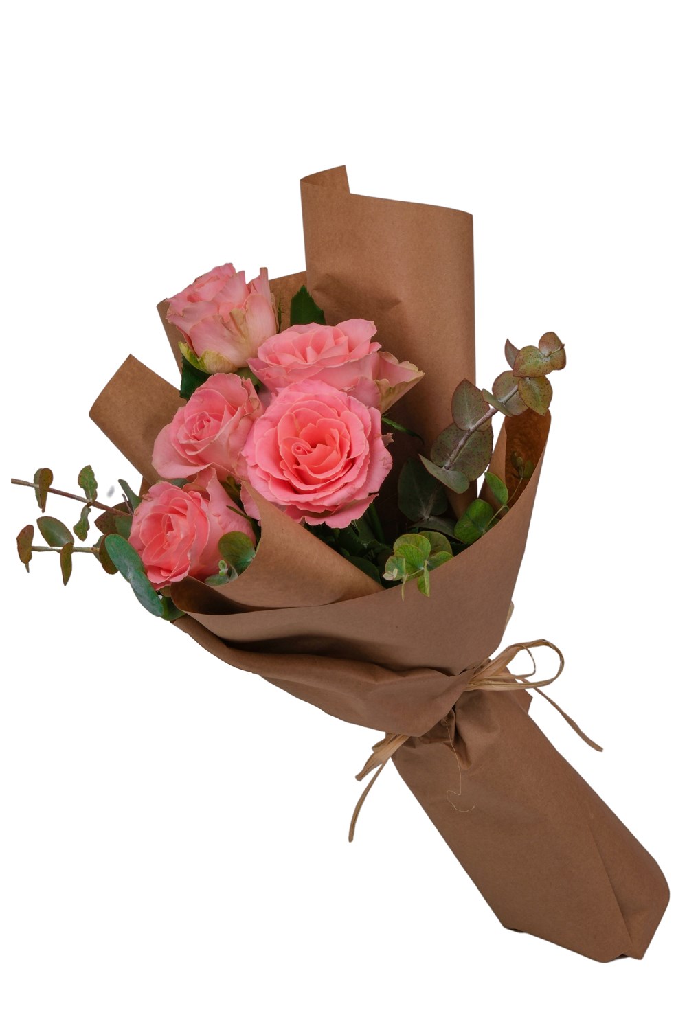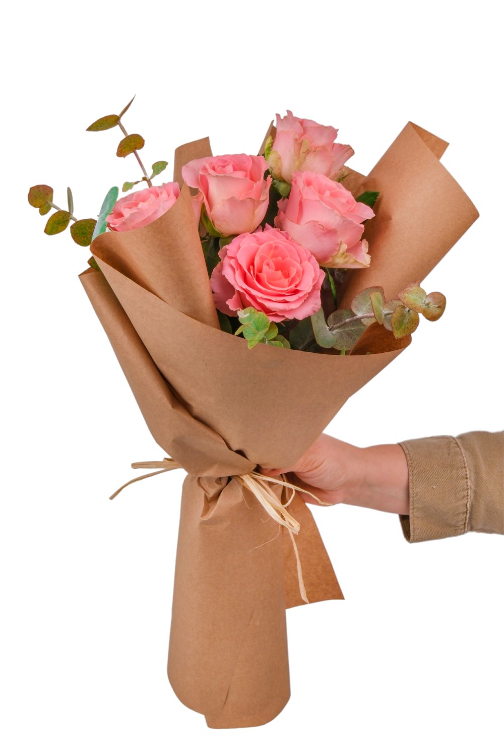 Pembe Gül Buketi; canlı tonlardaki güllerin doğal kraft ambalaj ile buluştuğu modern bir tasarımdır. Okaliptus dokunuşu ile zenginleştirilen buket, romantik ama abartısız bir şıklık sunar.