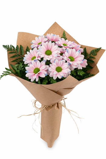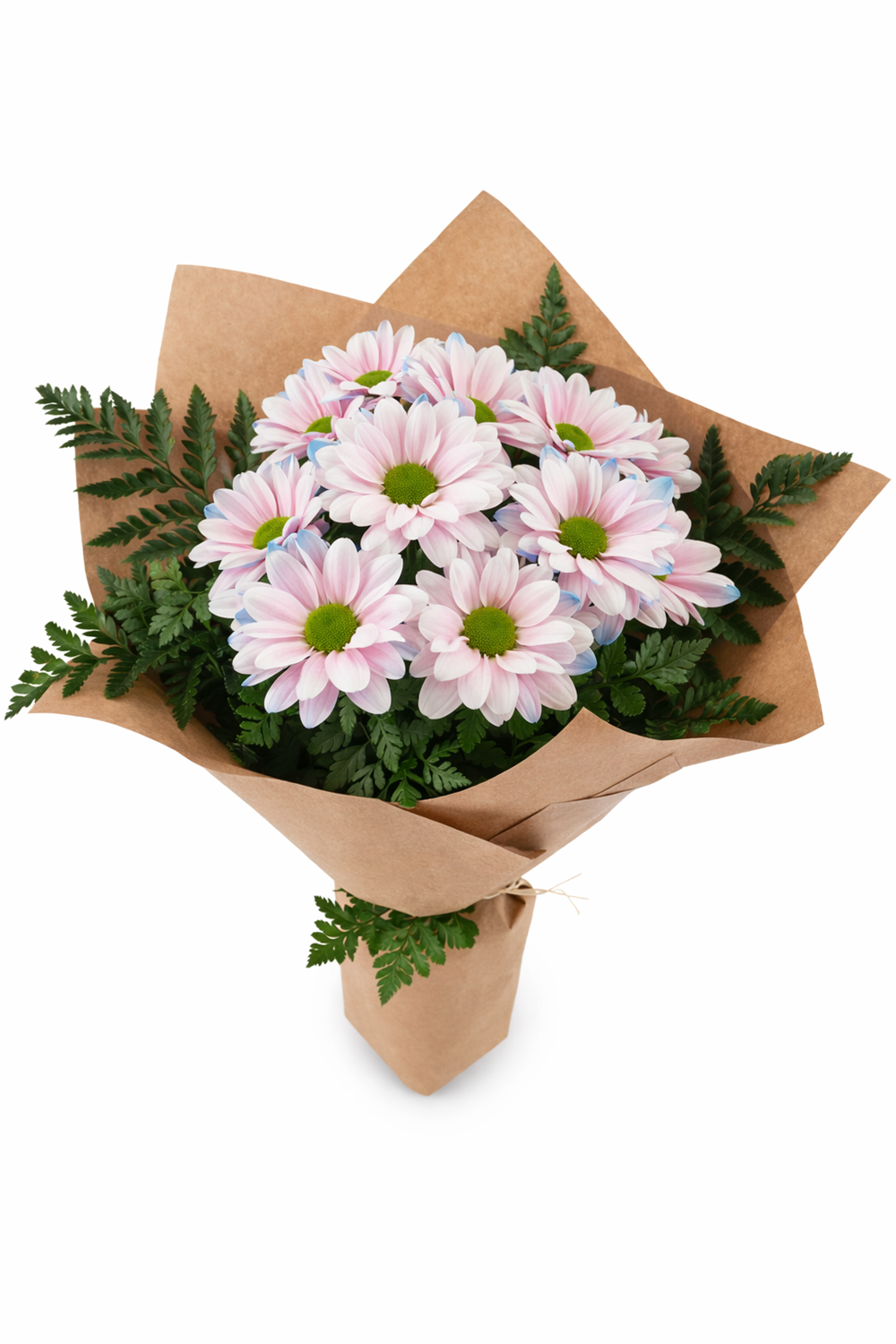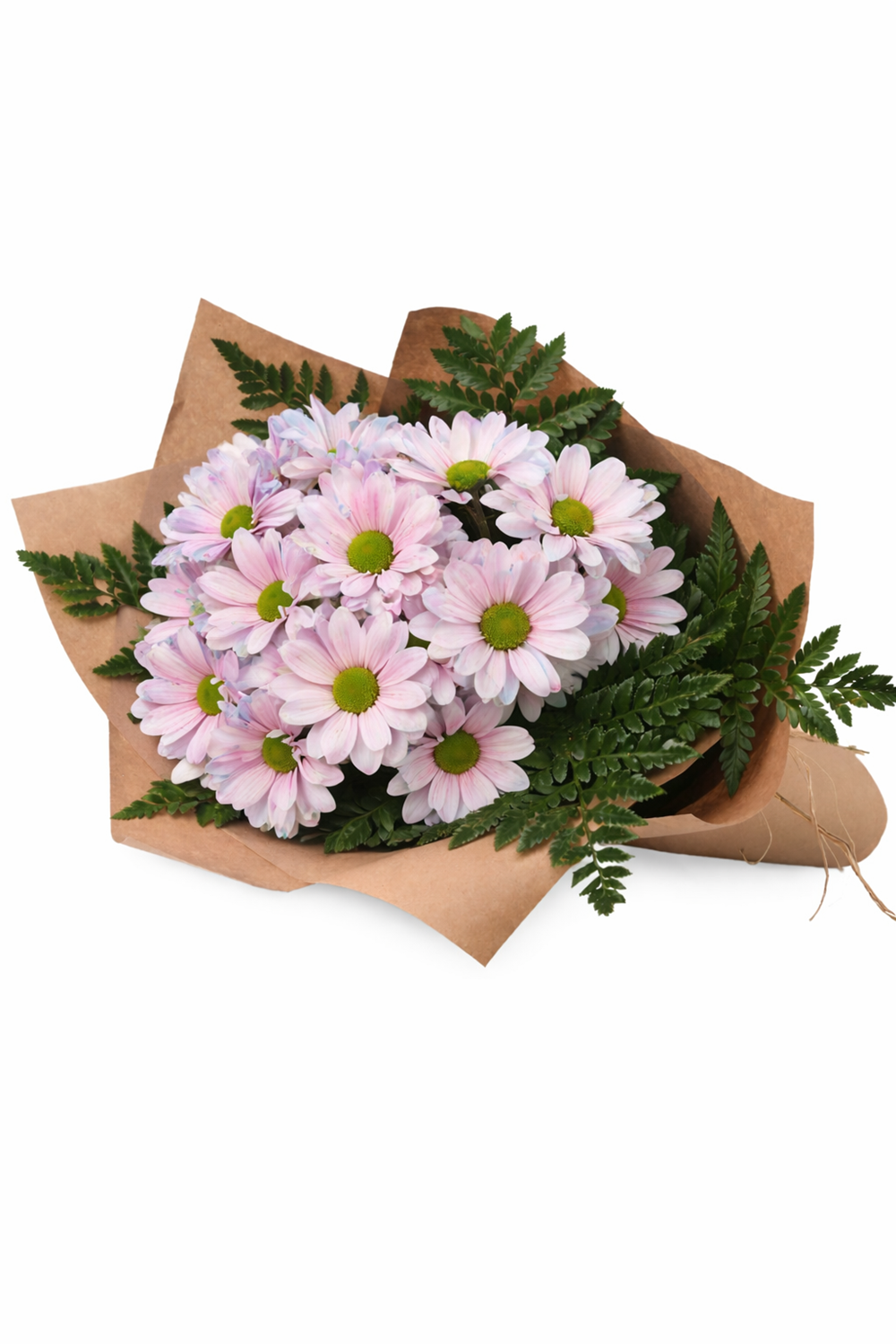 Rosé Daisy, pembe tonlu papatyaların yumuşak dokusunu doğal yeşilliklerle buluşturan modern bir Punica tasarımıdır. Sade kraft ambalaj ve minimal bağlama detayı ile tamamlanan buket; hem romantik hem de günlük hediye tercihleri için ideal bir seçenektir.