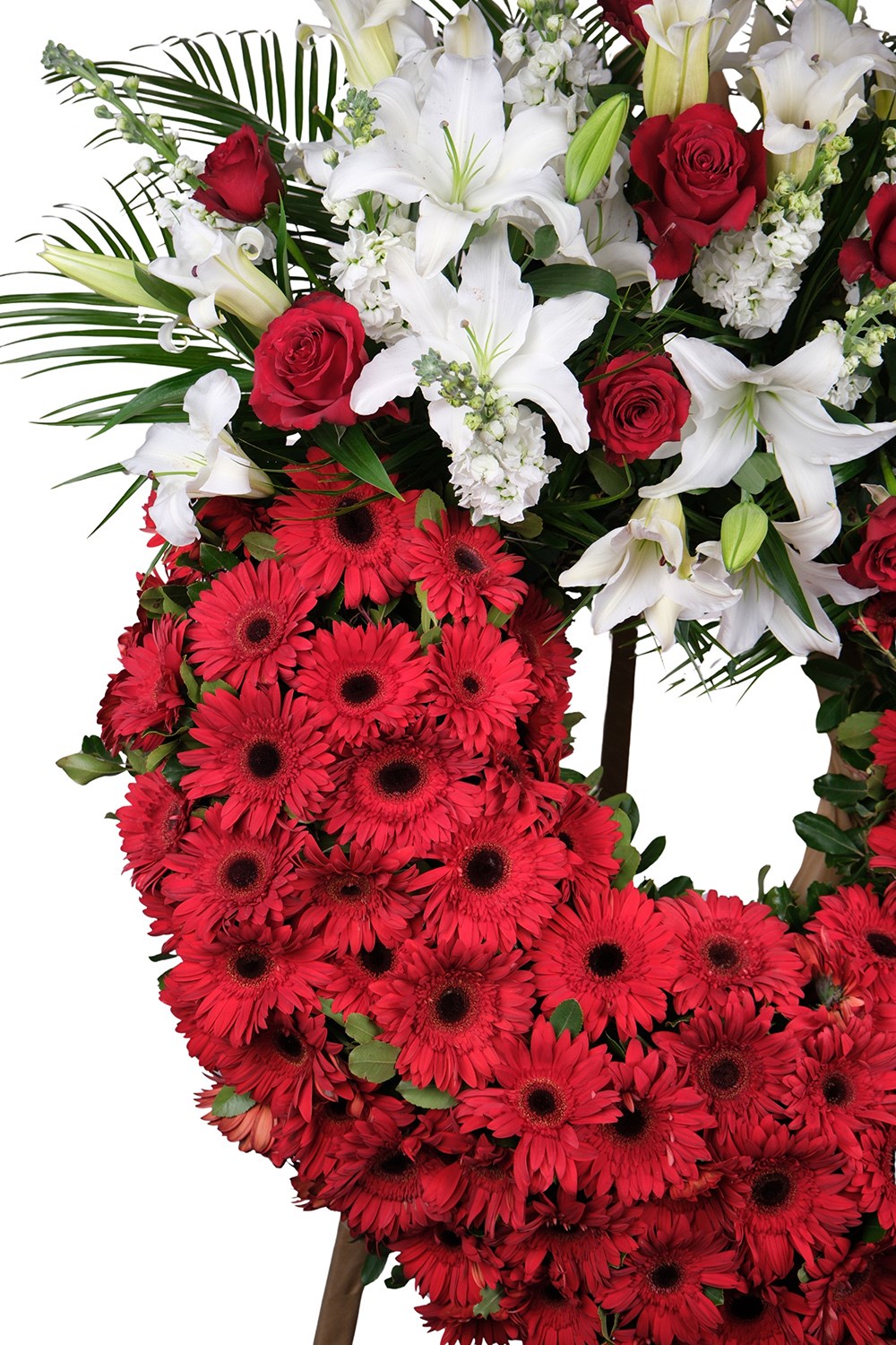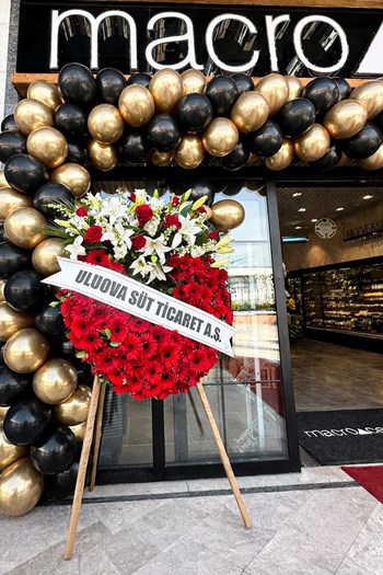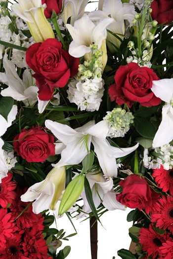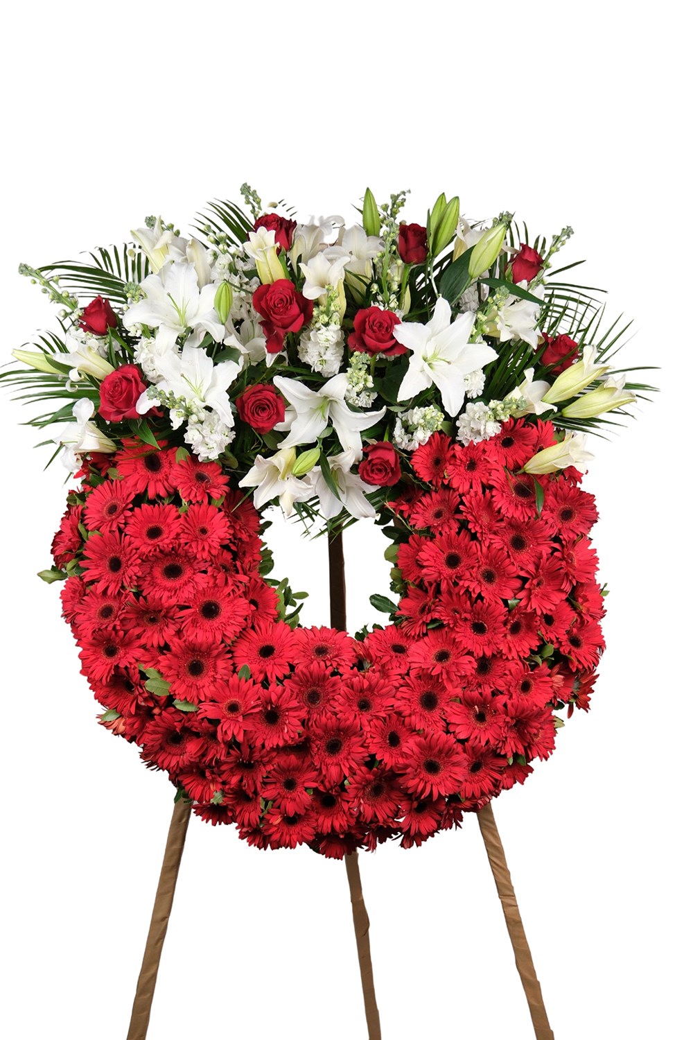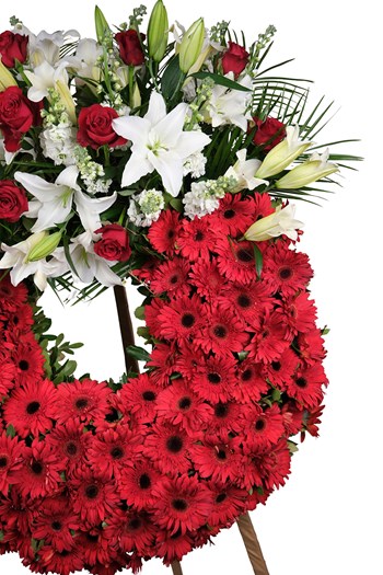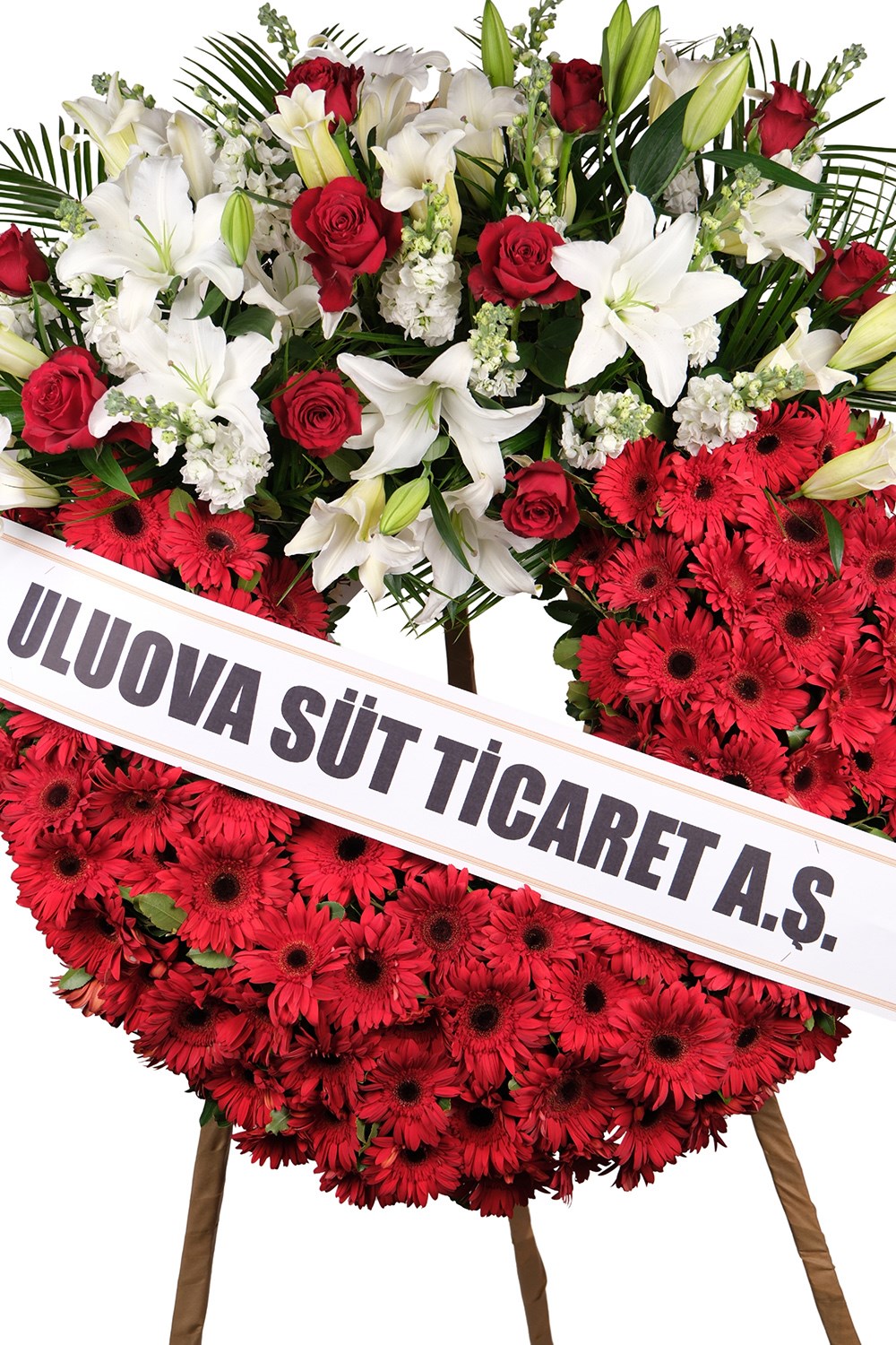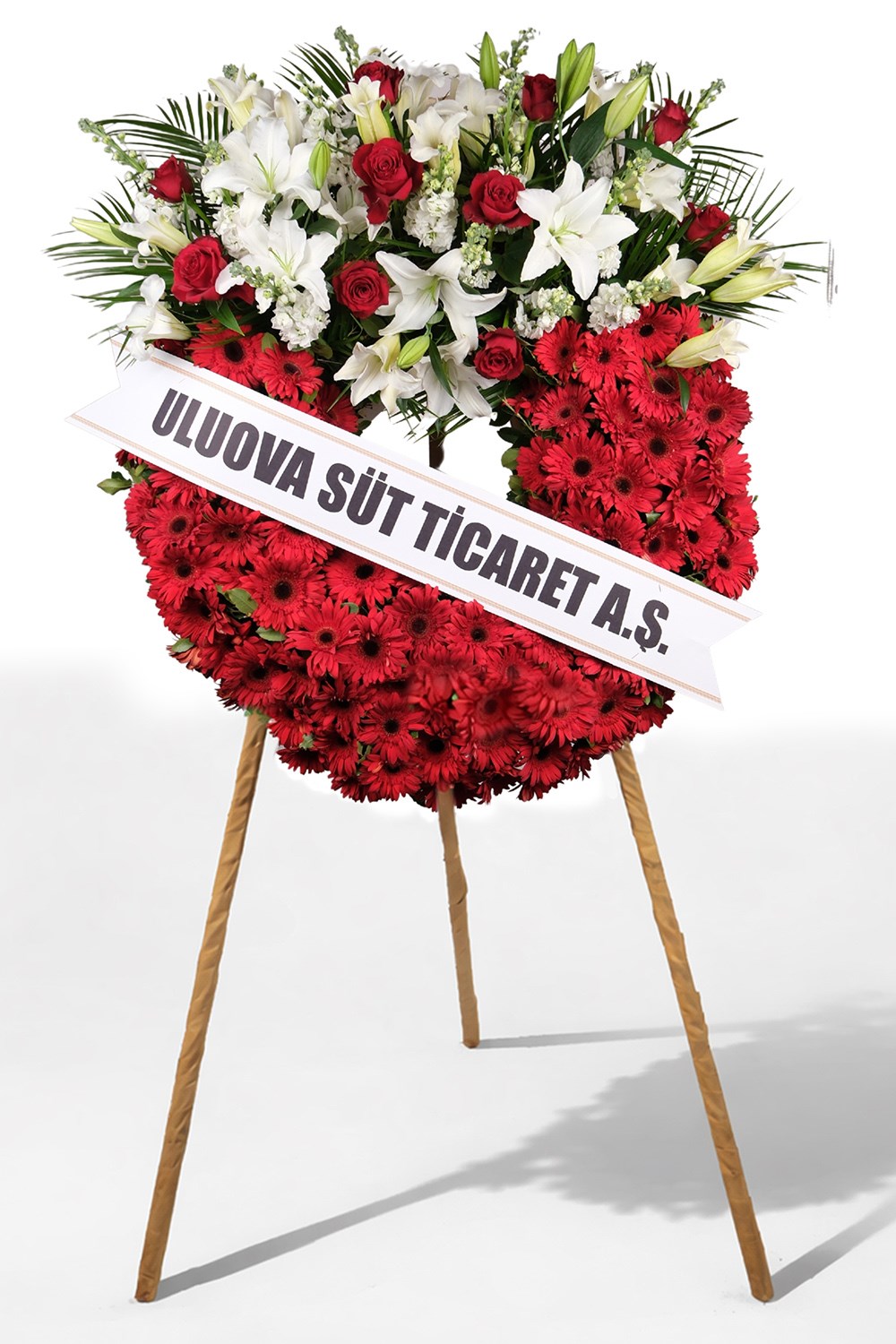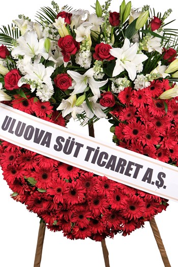 Kırmızı gerbera, beyaz lilyum ve kırmızı güllerin uyumu ile hazırlanan bu çelenk; özellikle kurumsal gönderimler ve önemli organizasyonlar için tercih edilmektedir.