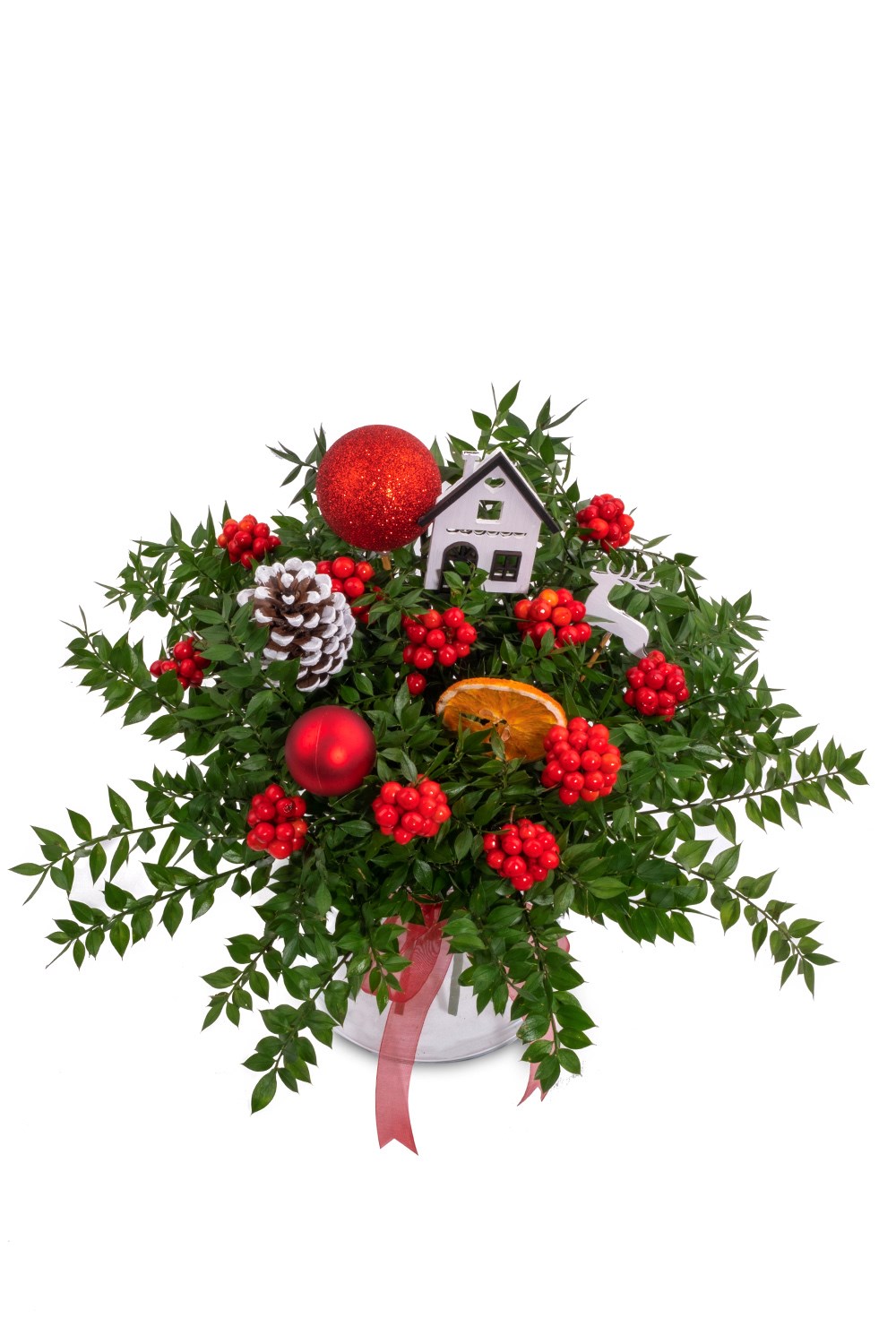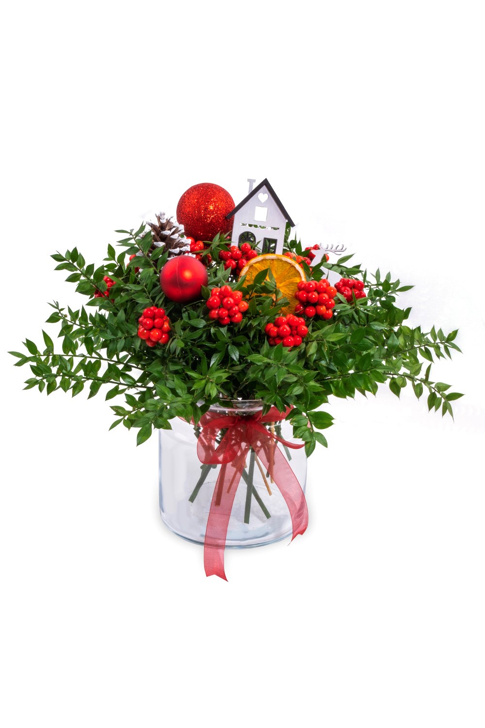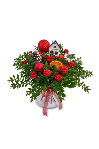 Canlı kokina (ilex) dalları, yoğun yeşillikler ve özel yılbaşı objeleri ile hazırlanan, cam vazoda premium yeni yıl aranjmanı.