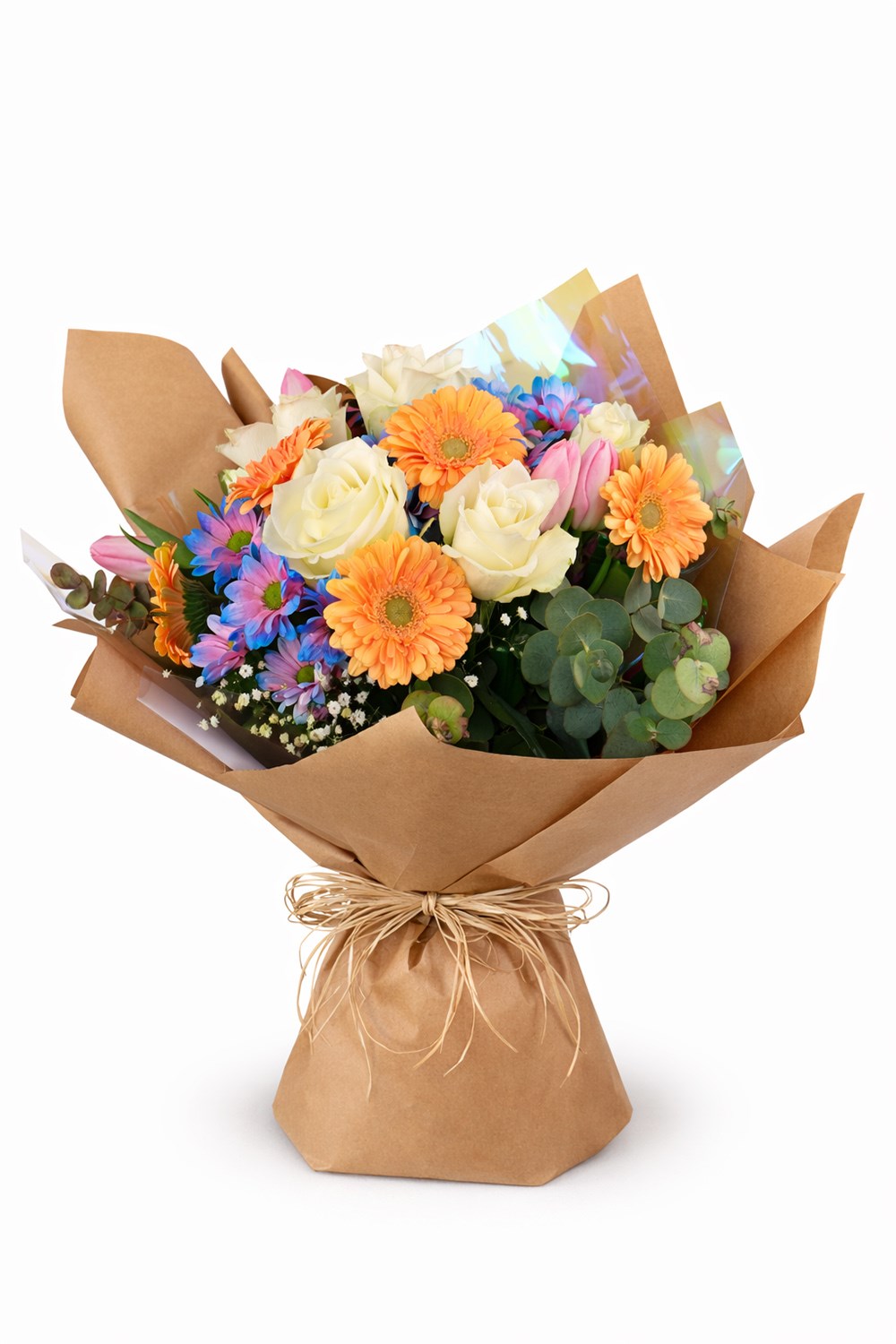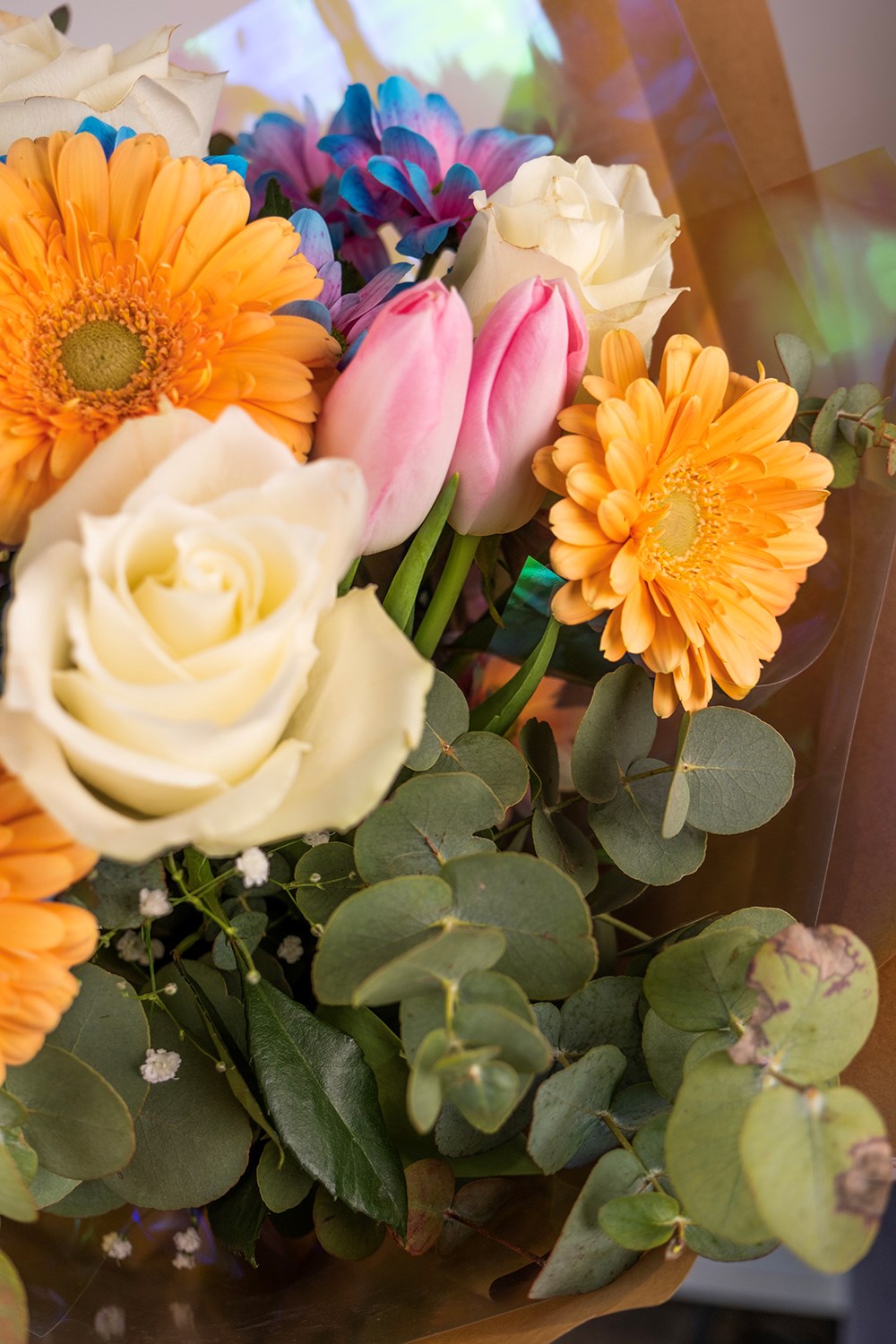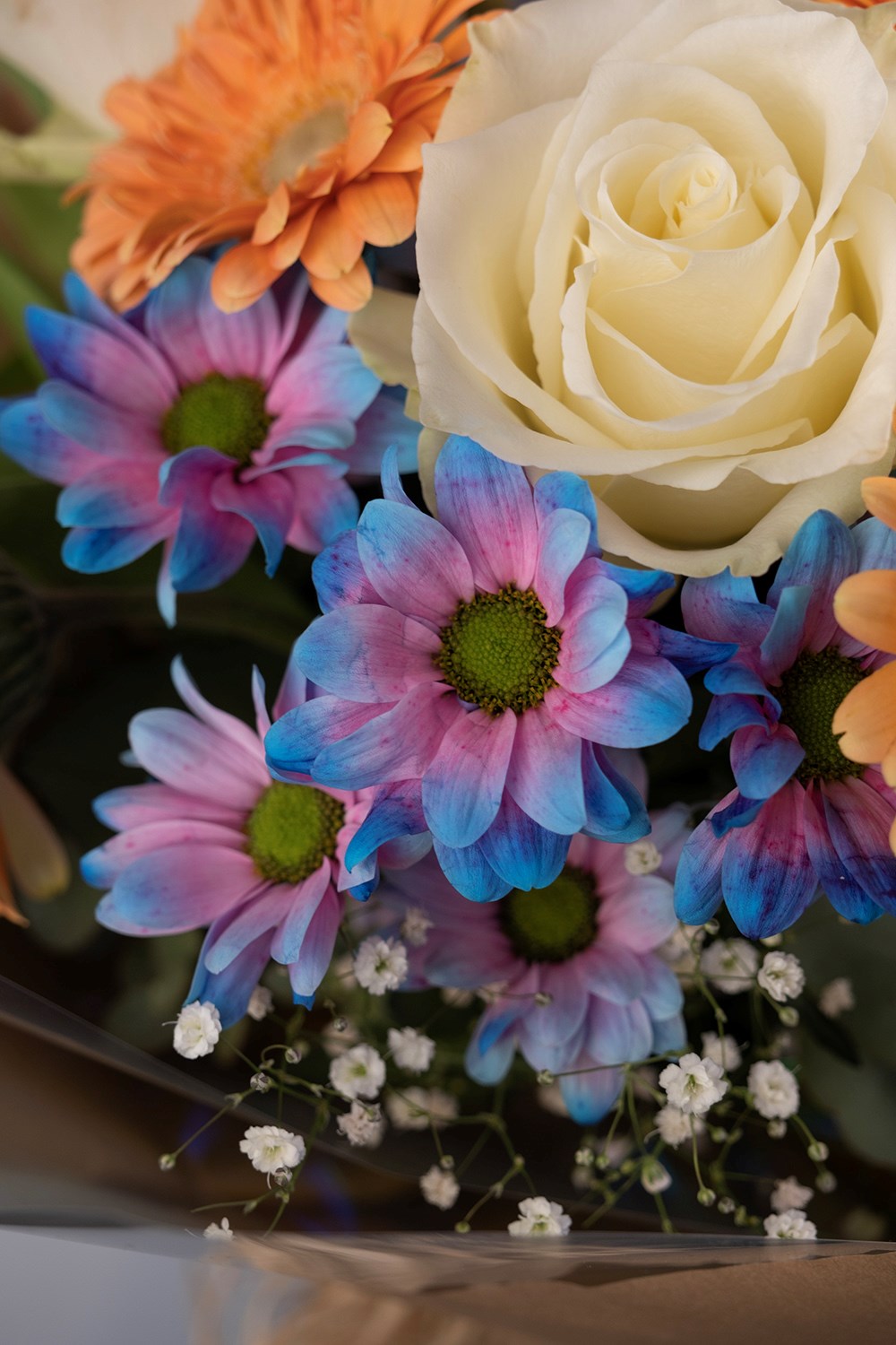 Punica Çiçek Evi’nin özel tasarımlarından biri olan Aurora buketi, beyaz güllerin zarafeti ve canlı renkli çiçeklerin enerjisiyle hazırlanmıştır.