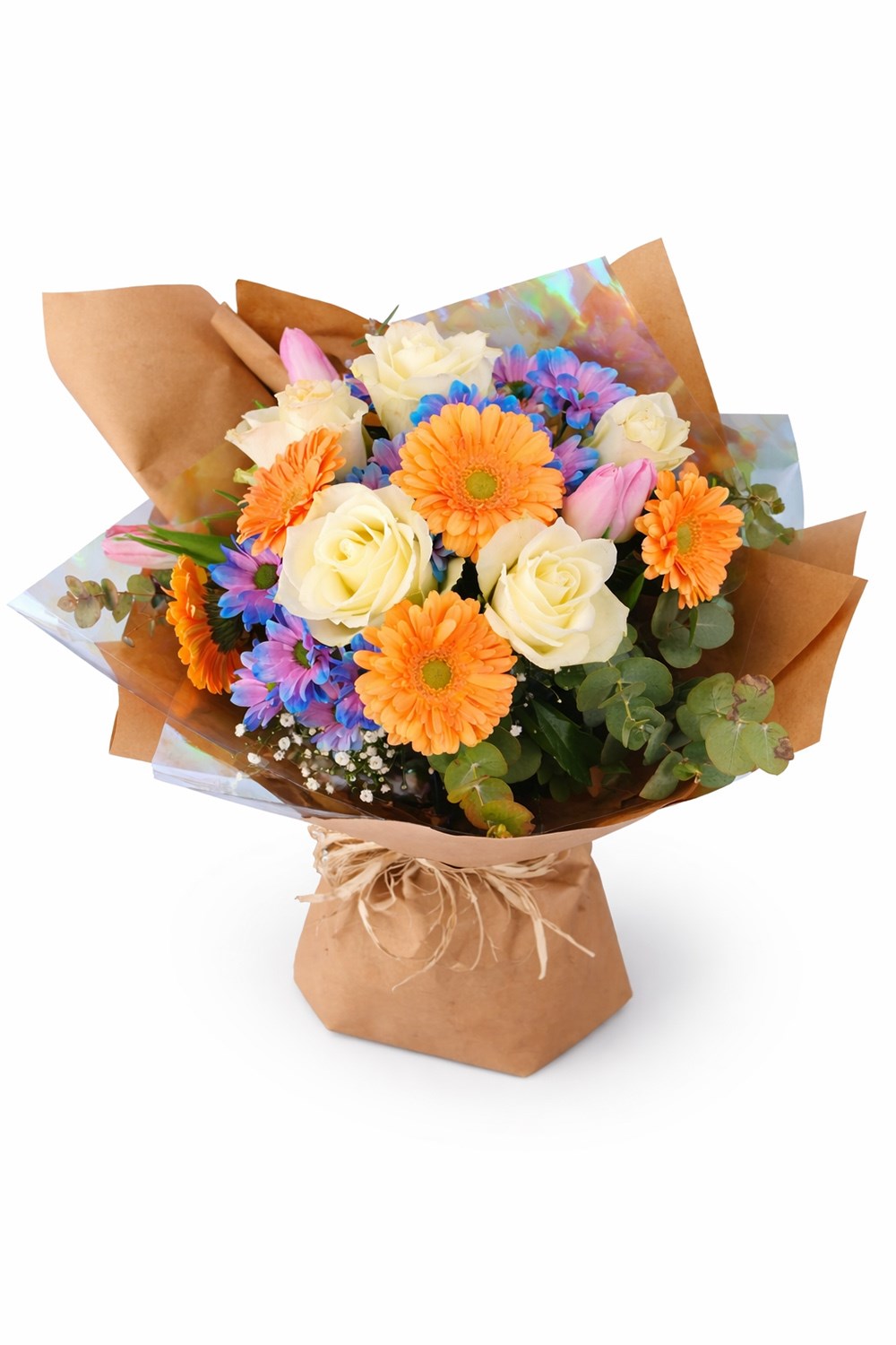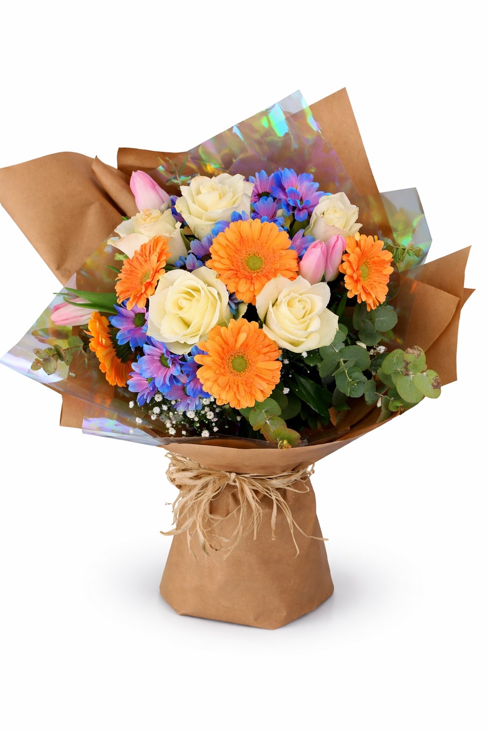 Turuncu gerberalar, mavi ton çiçekler ve pastel dokunuşlarla zenginleştirilen bu aranjman, hologram jelatin ambalajı sayesinde ışıkla birlikte farklı bir görsel etki yaratır.