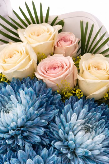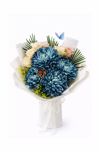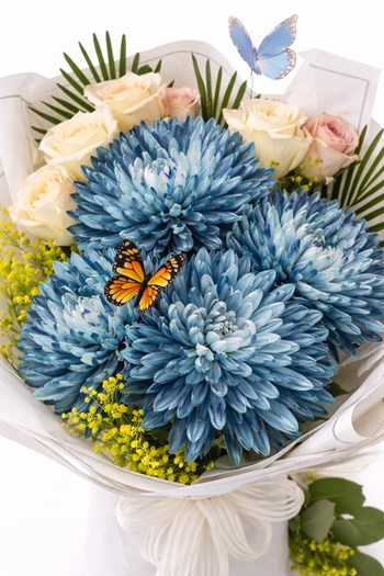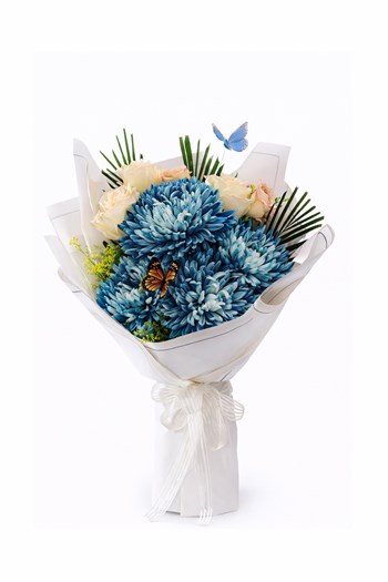 Punica Çiçek Evi tarafından hazırlanan Blue Elegance buketi, mavi krizantemlerin güçlü ve dikkat çekici görünümü ile beyaz güllerin sade zarafetini bir araya getirir.