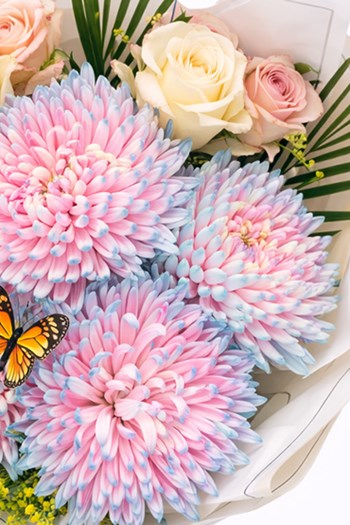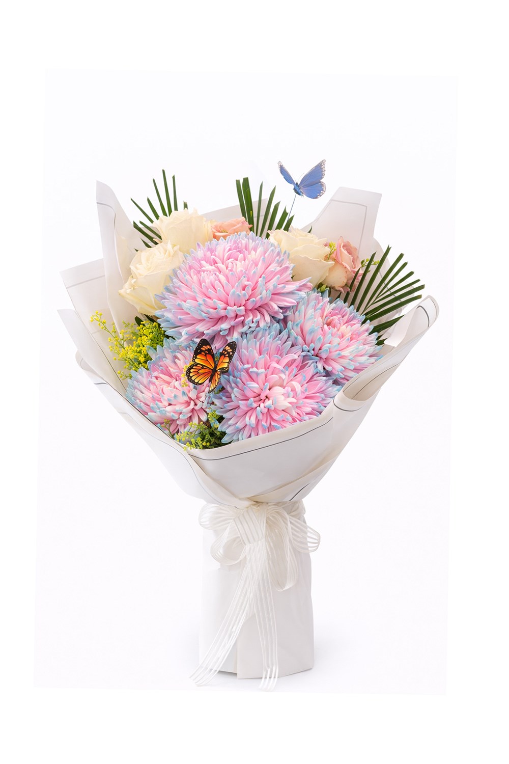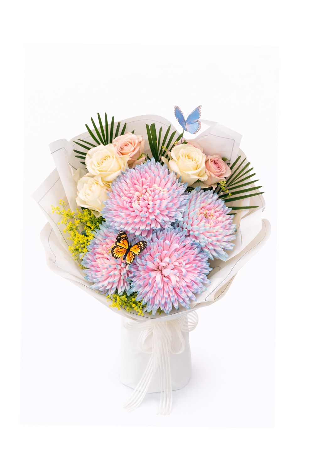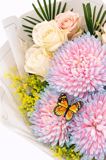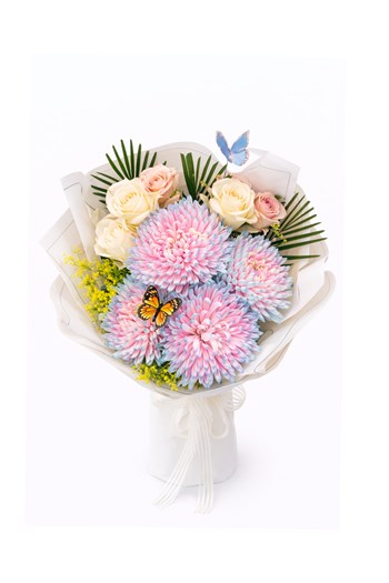 Pastel tonlu özel krizantemler ve zarif güllerin birleşimi… Kelebek detaylı romantik tasarım. Çanakkale’de aynı gün teslim.