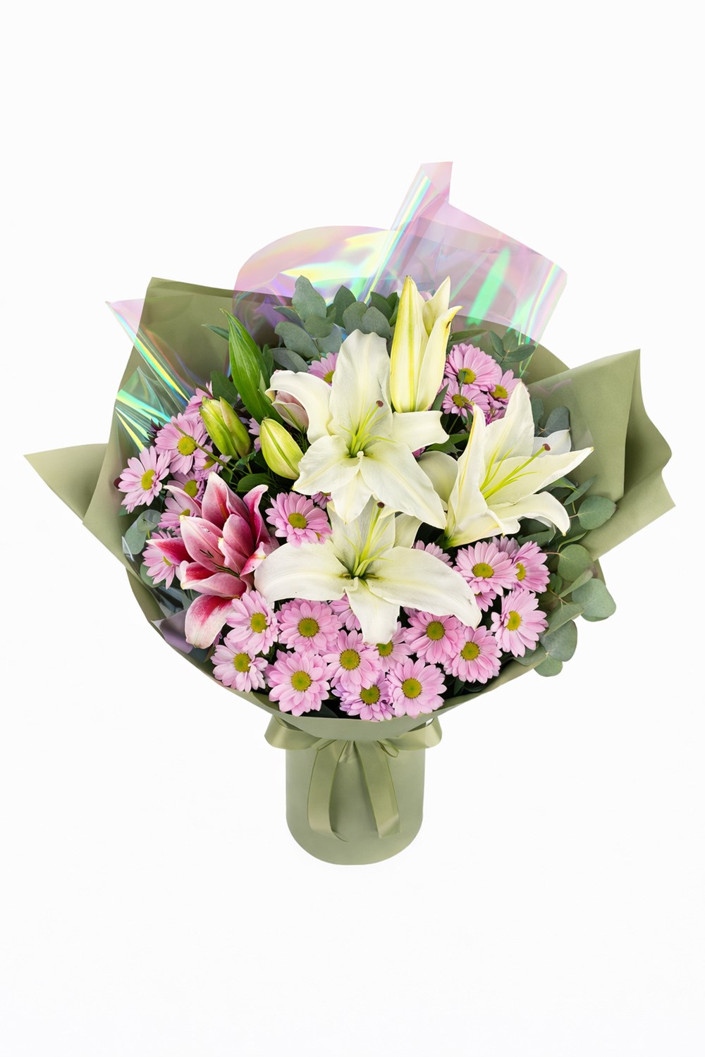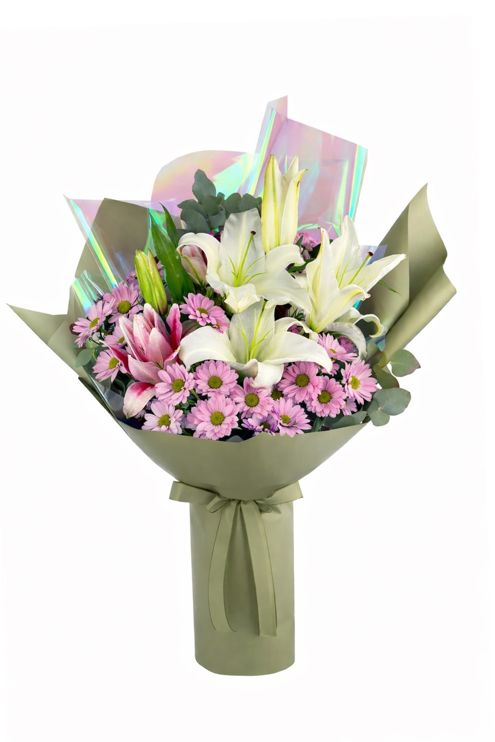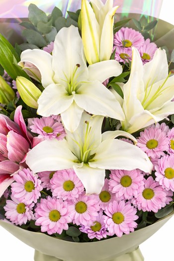 Lilyum ve pembe papatyaların zarif uyumuyla hazırlanan bu özel buket,