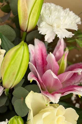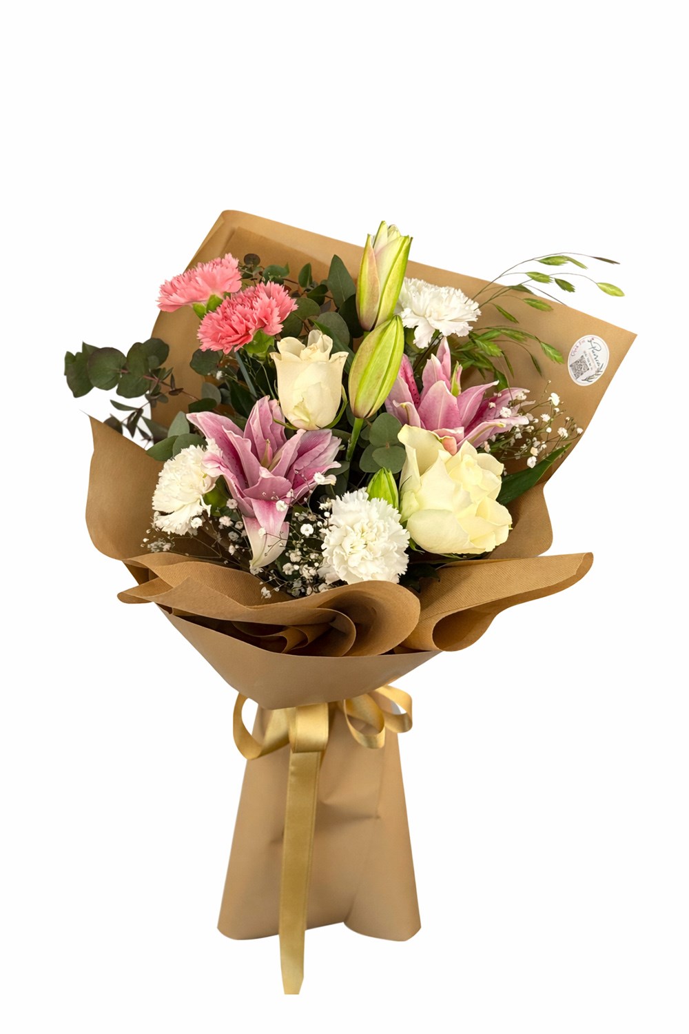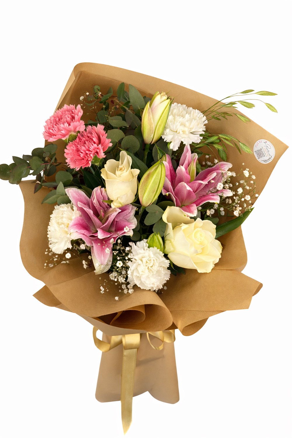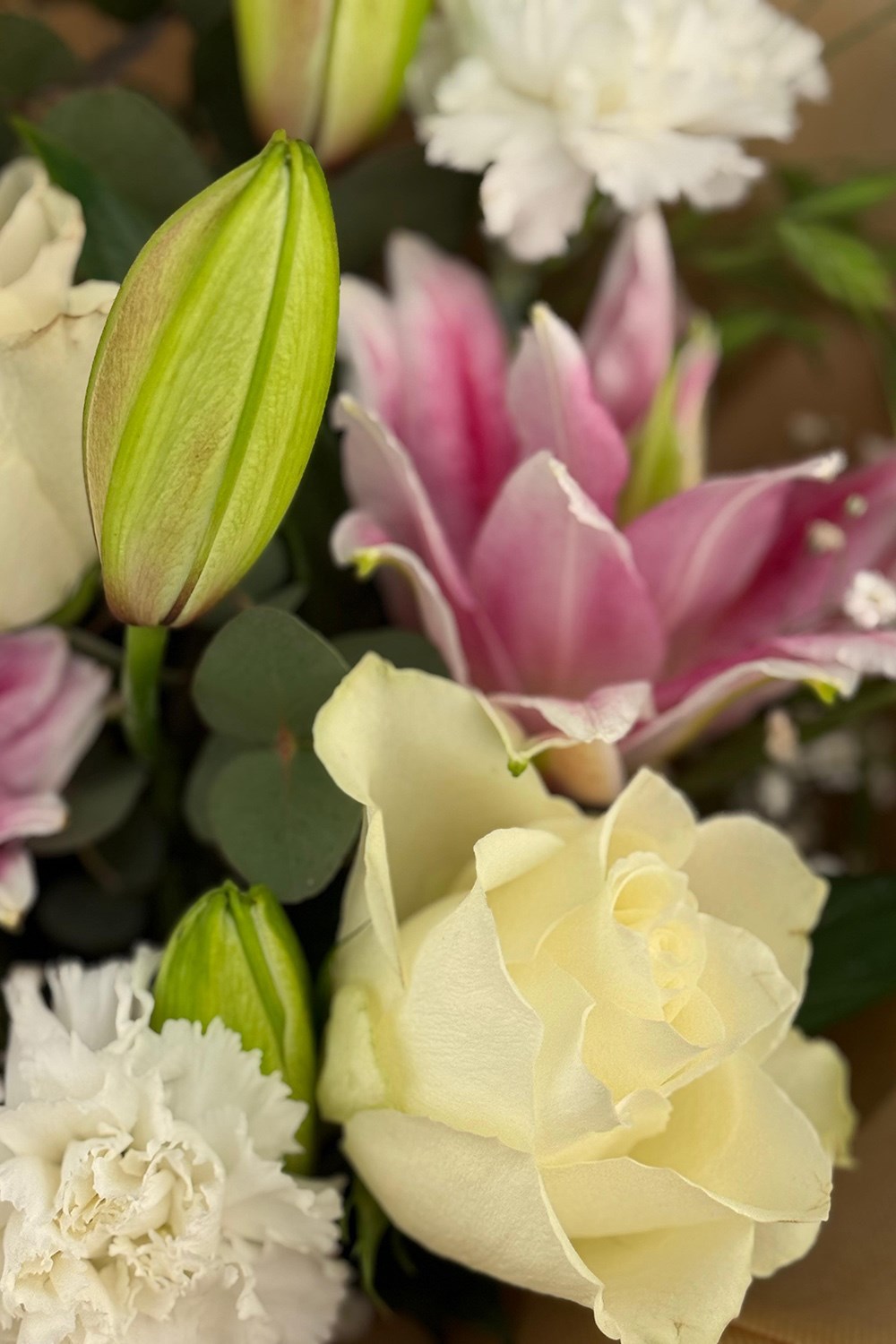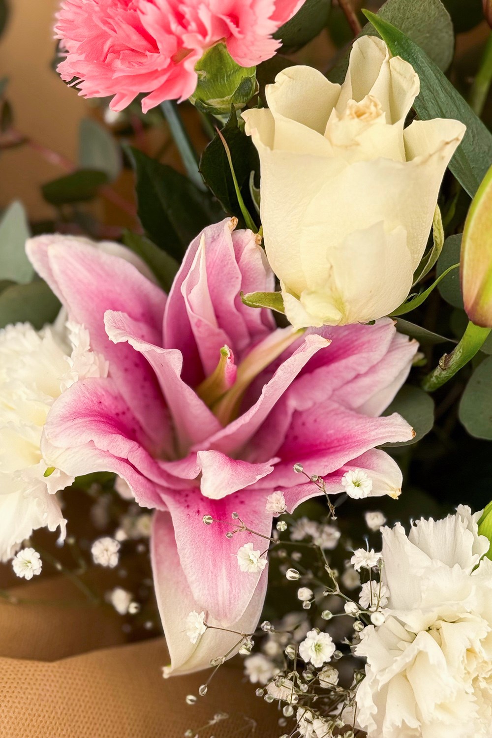 Punica Çiçek Evi tarafından özenle hazırlanan Lilyum ve Beyaz Gül Buketi, zarif renk uyumu ve şık sunumuyla özel anlara anlam katmak için tasarlanmıştır. Pembe lilyumların gösterişli formu, beyaz güllerin sade ve asil duruşu, karanfillerin yumuşak dokusu ve doğal yeşilliklerle dengeli bir bütün oluşturur.