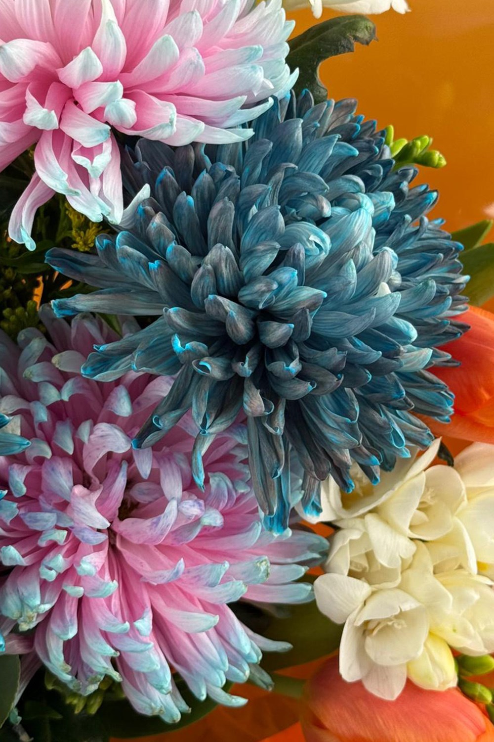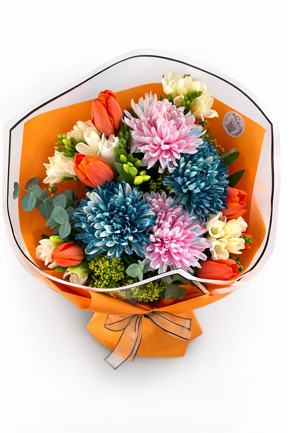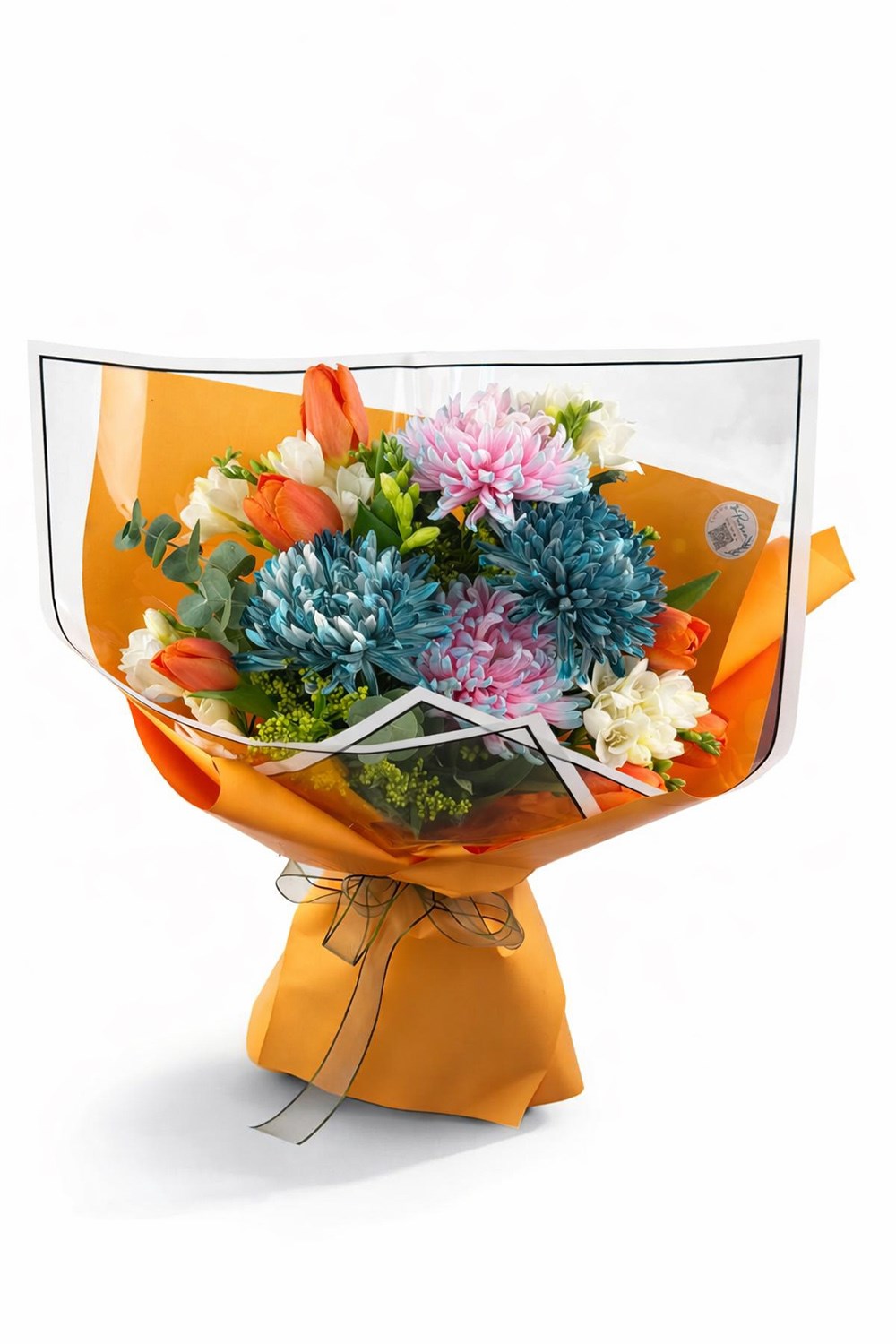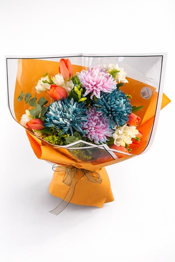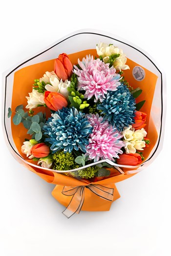 Punica Color Harmony buketi, turuncu laleler, pastel tonlu krizantemler ve beyaz çiçeklerin uyumuyla hazırlanan canlı ve modern bir çiçek tasarımıdır. Renk geçişleri ve zengin çiçek çeşitliliği ile dikkat çeken bu buket, özel anlar için enerjik ve şık bir hediye alternatifidir.