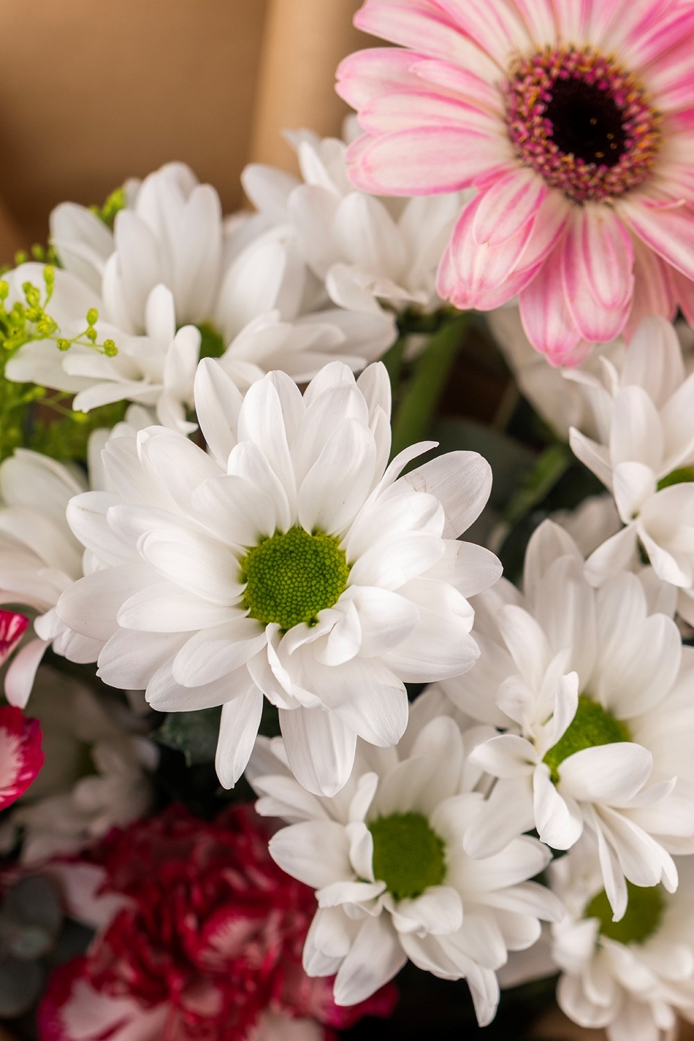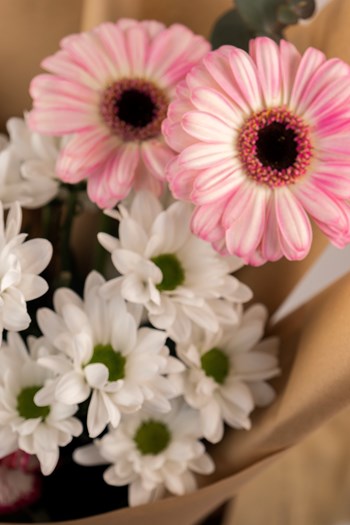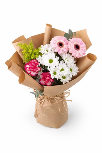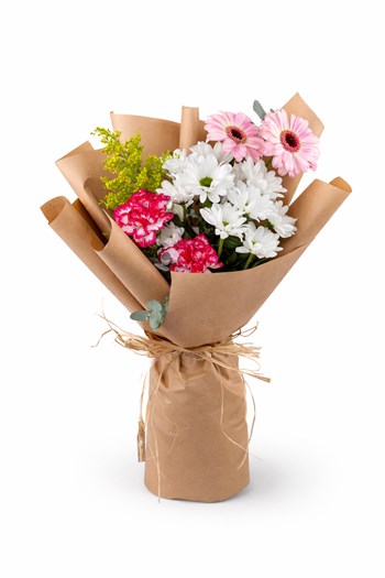 Punica Çiçek Evi’nin doğal ve zarif tasarımlarından biri olan bu buket, pembe gerberaların enerjisi ve beyaz papatyaların sadeliği ile hazırlanmıştır.