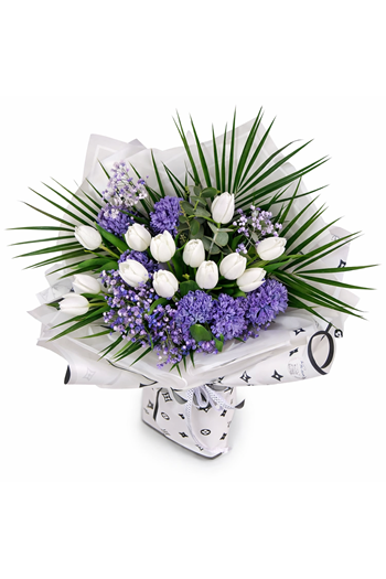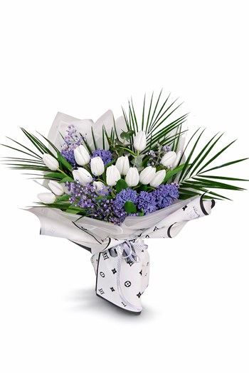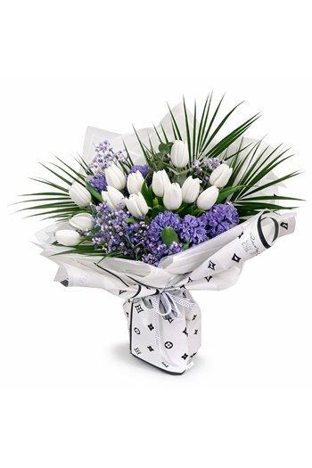 Beyaz laleler, mor sümbül ve zarif mor dokularla hazırlanan modern ve gösterişli bir buket tasarımı. Ferah renkleriyle şık ve sofistike bir hediye seçeneğidir.