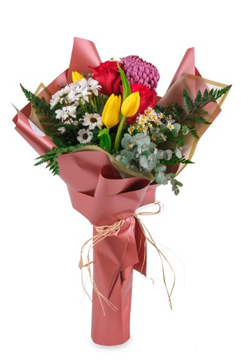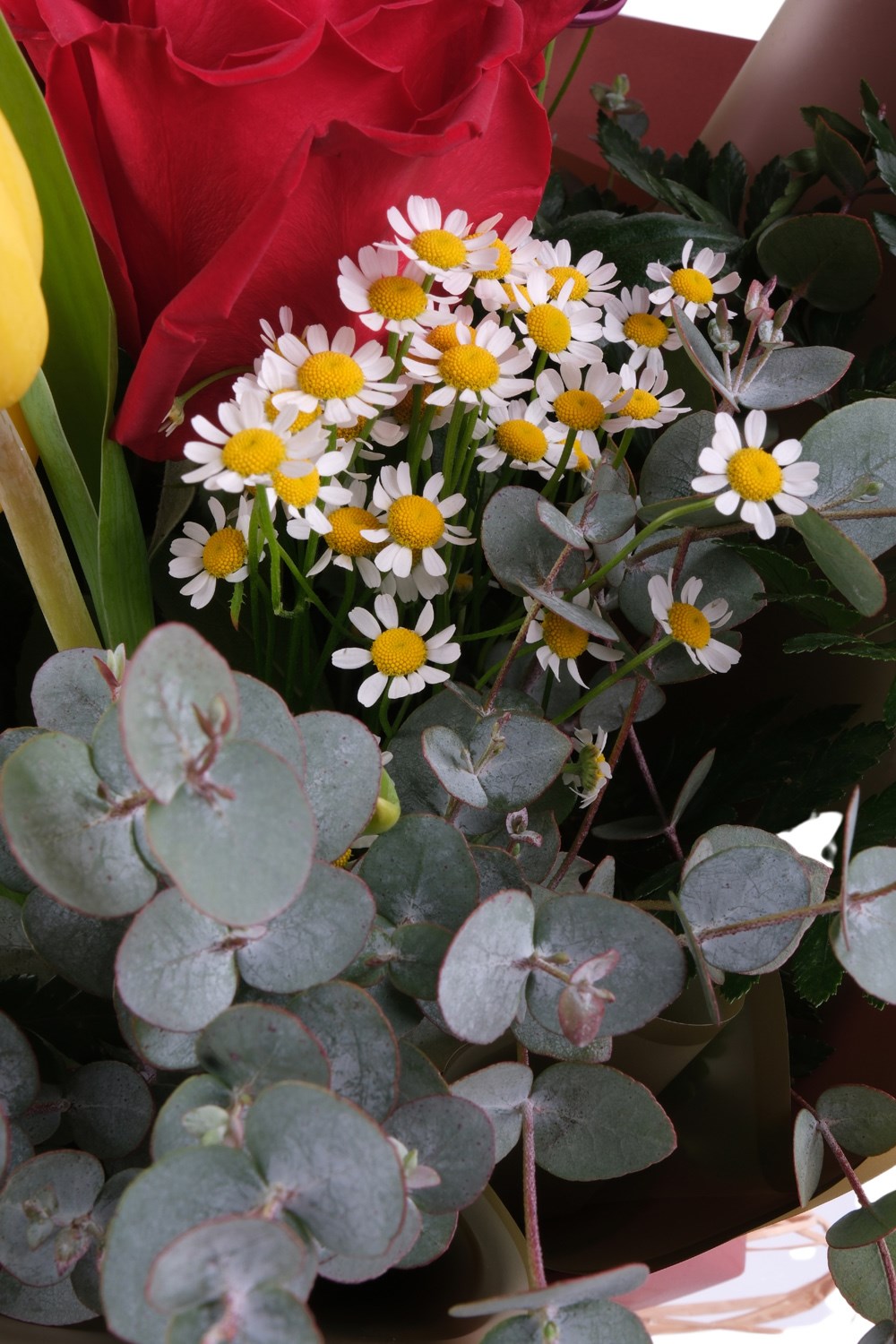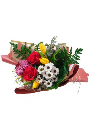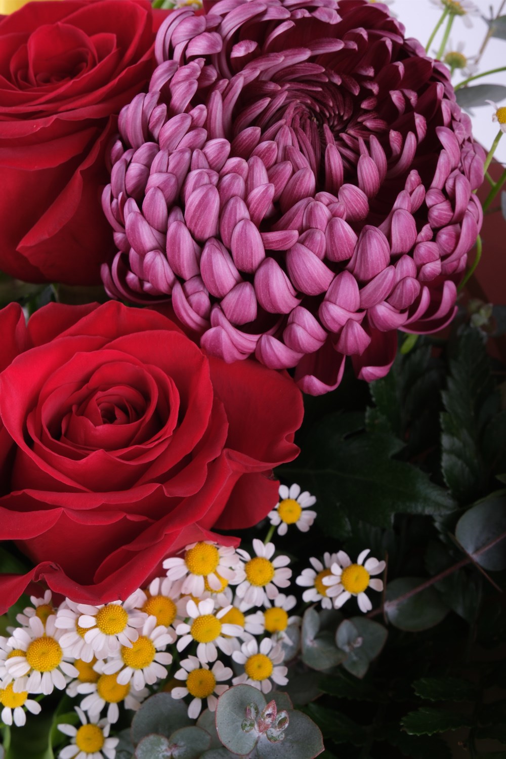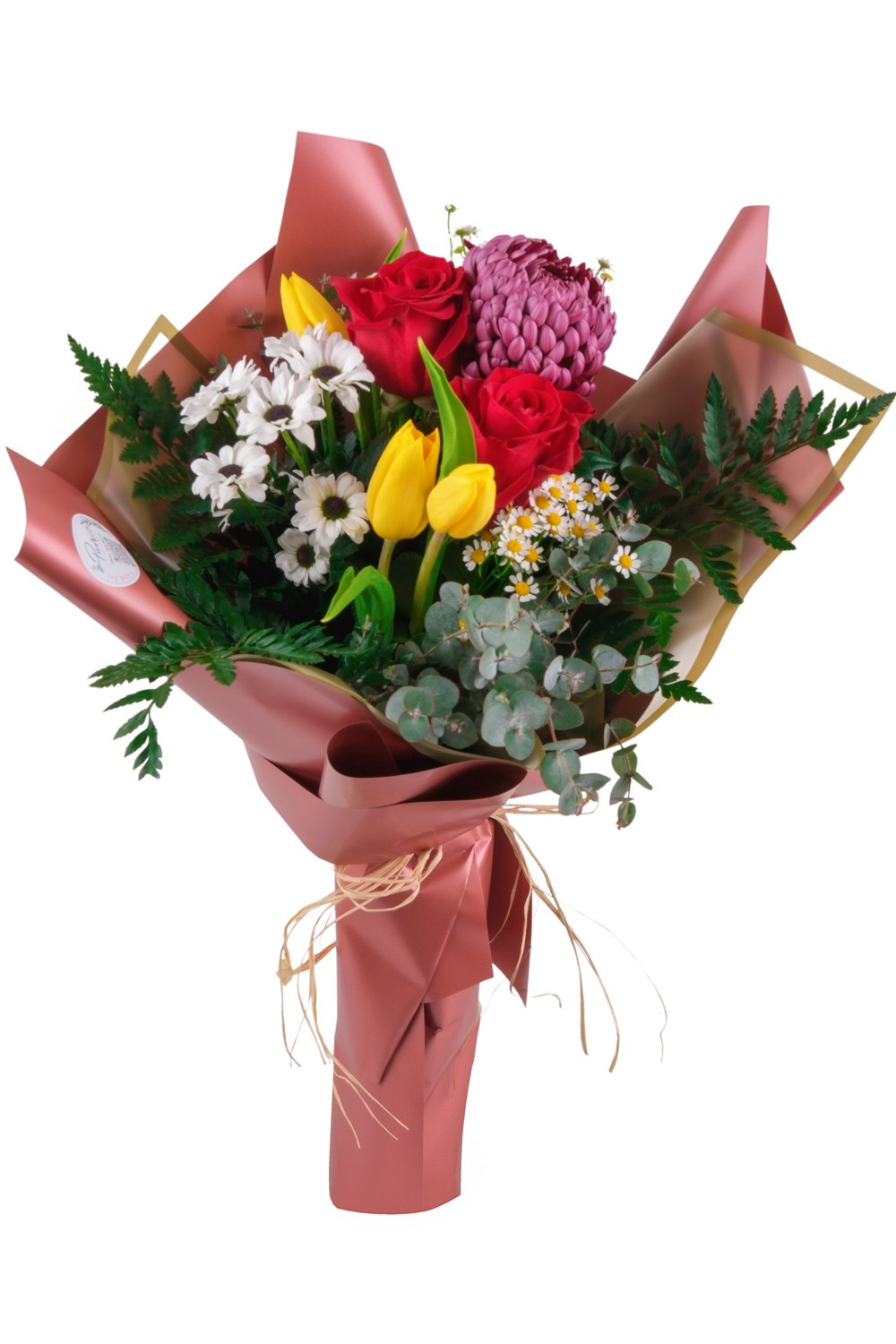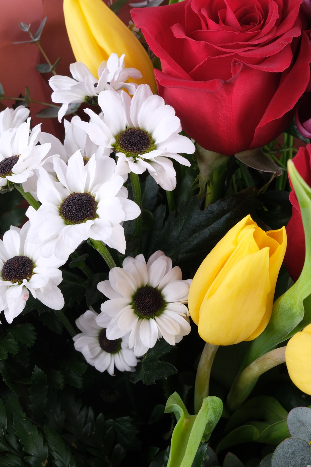 Rouge Soleil, kırmızı gülün romantizmini, sarı lalenin canlılığı ve mevsim çiçeklerinin doğal dokusuyla buluşturur. Mor krizantem ve beyaz papatya detayları ile tasarıma hareket ve karakter kazandırılmıştır.