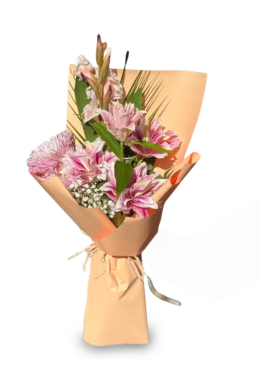 Soft Peach Lilyum Buketi, şeftali tonlarındaki modern sargısı ve pastel pembe çiçekleri ile sade ama etkileyici bir tasarım sunar.