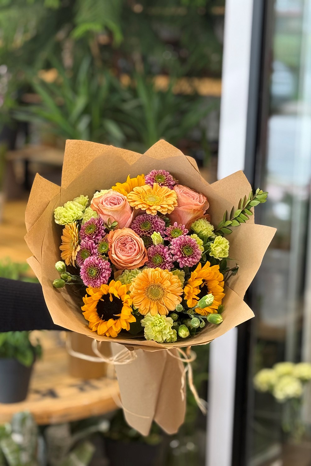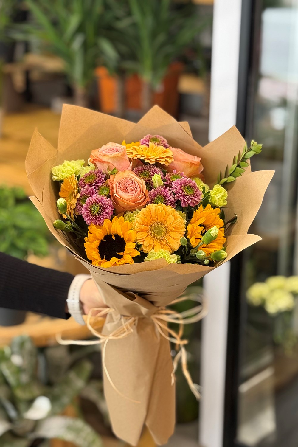 Ayçiçeğinin güçlü duruşu, gerberaların canlılığı ve pastel tonlu güllerin zarafeti bir araya gelerek sıcak, samimi ve unutulmaz bir etki yaratır.