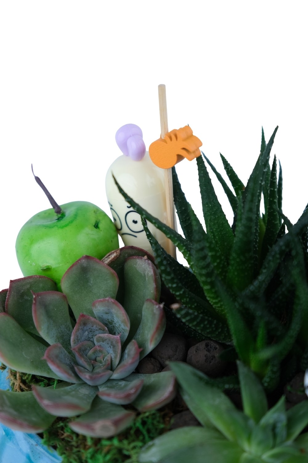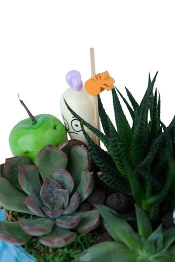 Modern mavi ayaklı seramikte hazırlanmış çoklu sukulent ve kaktüs aranjmanı. Dekoratif figür detaylarıyla uzun ömürlü ve özel bir hediye seçeneği.Bu özel aranjman; birden fazla sukulent ve kaktüs türünün, modern çizgili mavi ayaklı seramik içerisinde bir araya getirilmesiyle hazırlanmış dekoratif bir tasarımdır. Doğal yosun, seçme bitkiler ve sevimli figür detaylarıyla hem ev hem de ofis dekorasyonlarında dikkat çekici bir görünüm sağlar. Özellikler Bitkiler: Mini sukulent çeşitleri + Opuntia kaktüs + Haworthia Saksı: Ayaklı mavi çizgili seramik tasarım Dekor: Doğal yosun, minik hayvan figürü, yeşil elma obje, öğretmen temalı süs Kullanım alanı: Ev, ofis, çalışma masası, hediye amaçlı Avantajlar Az bakım isteyen uzun ömürlü bitkiler Modern dekoratif görünüm Hediye olarak her alanda kullanılabilir Bakım Önerileri Işık: Aydınlık ortam sever, direkt güneşten uzak tutulmalı. Sulama: 10–15 günde bir, çok az su verilmelidir. Konum: Havadar ve kapalı ortam uygundur. Dikkat: Fazla sulama kök çürümesine neden olabilir. Not Her aranjman canlı bitki kullanıldığı için bitki formu ve renk tonları küçük farklılıklar gösterebilir. Punica Çiçek Evi olarak tüm ürünleri özenle seçiyor ve güvenli biçimde paketliyoruz.