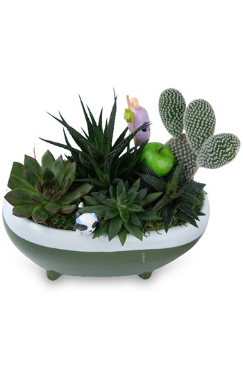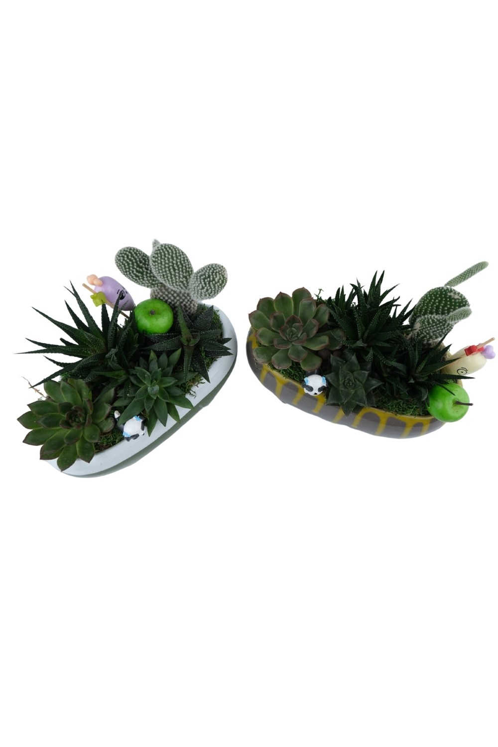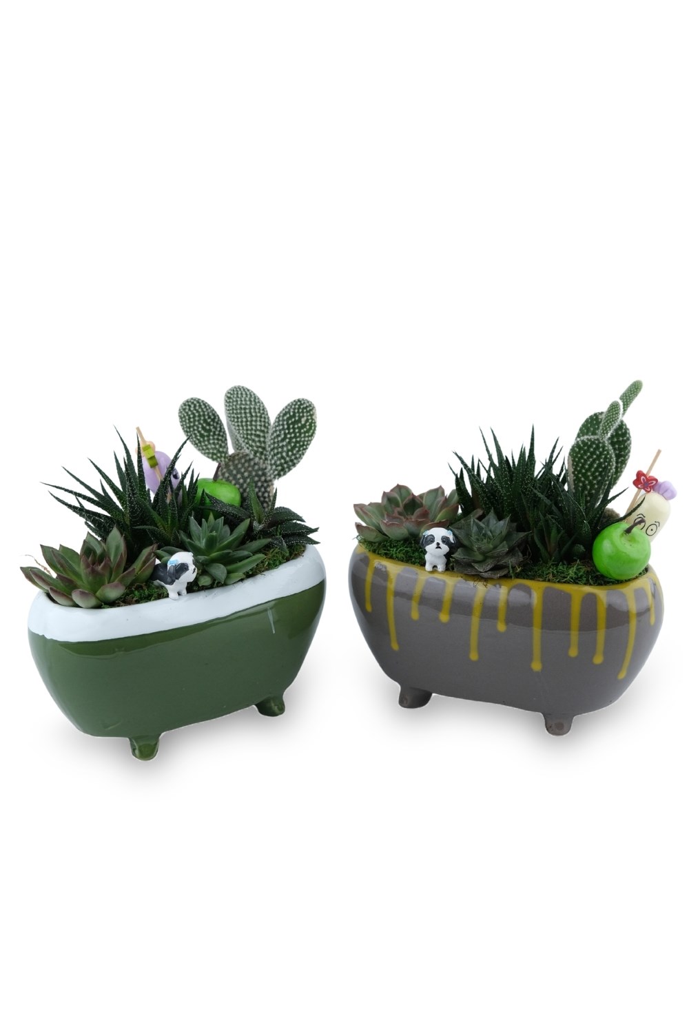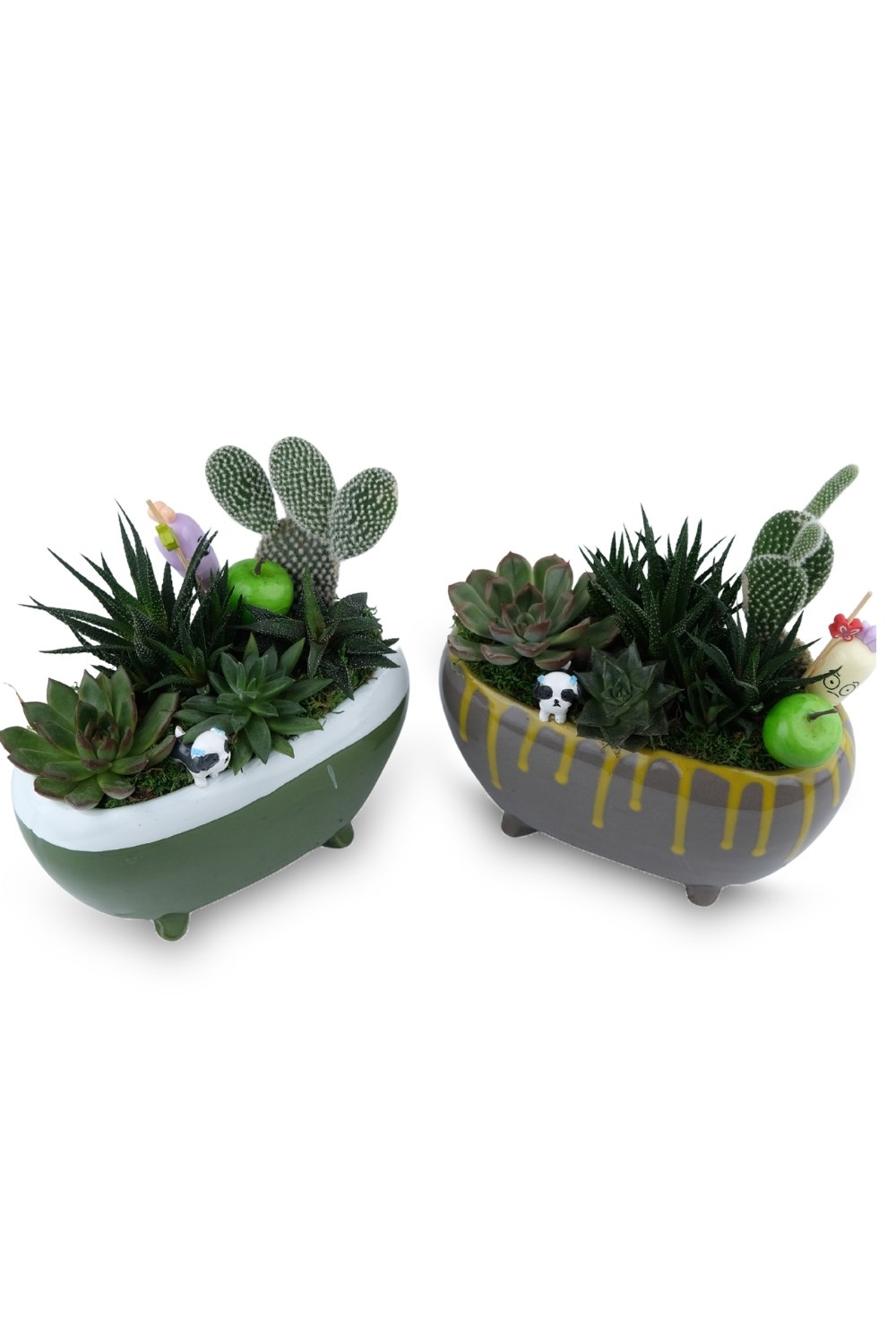 Modern ayaklı seramikte hazırlanmış çoklu sukulent & kaktüs aranjmanı. Yeşil–beyaz veya gri–sarı seramik seçenekleri mevcuttur. Sipariş notunda seçiminizi belirtmeniz yeterlidir.