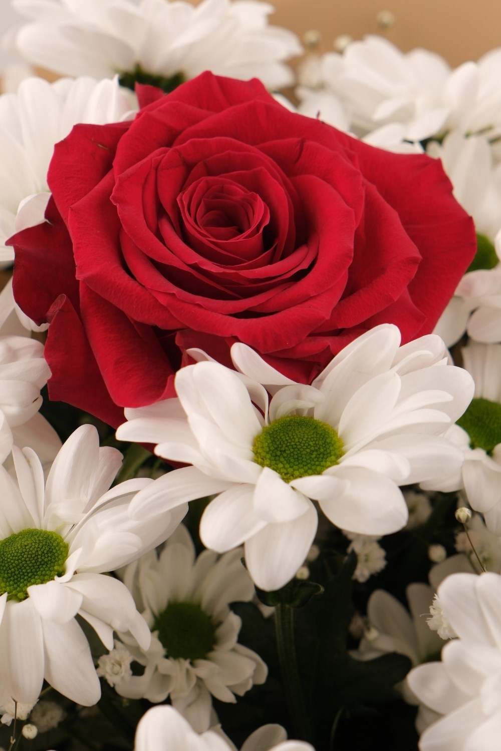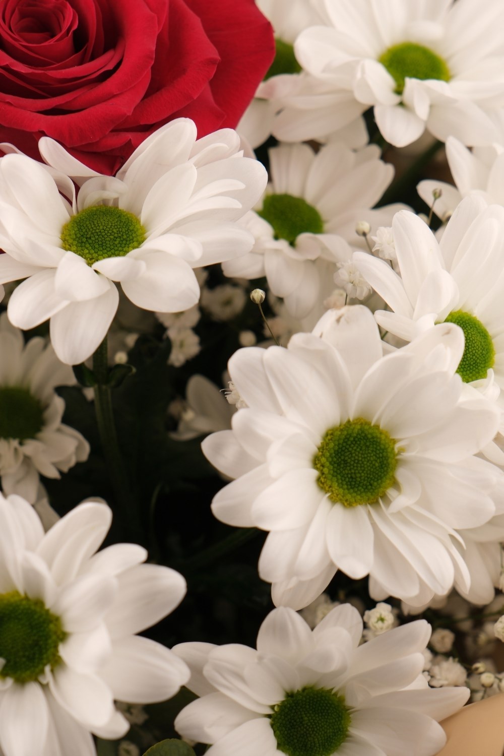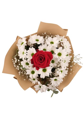 Aşkın simgesi kırmızı gül, saflığı temsil eden beyaz papatyalarla buluşarak zarif ve anlamlı bir buket haline getirildi.