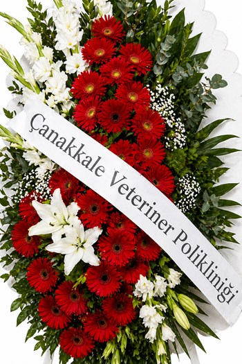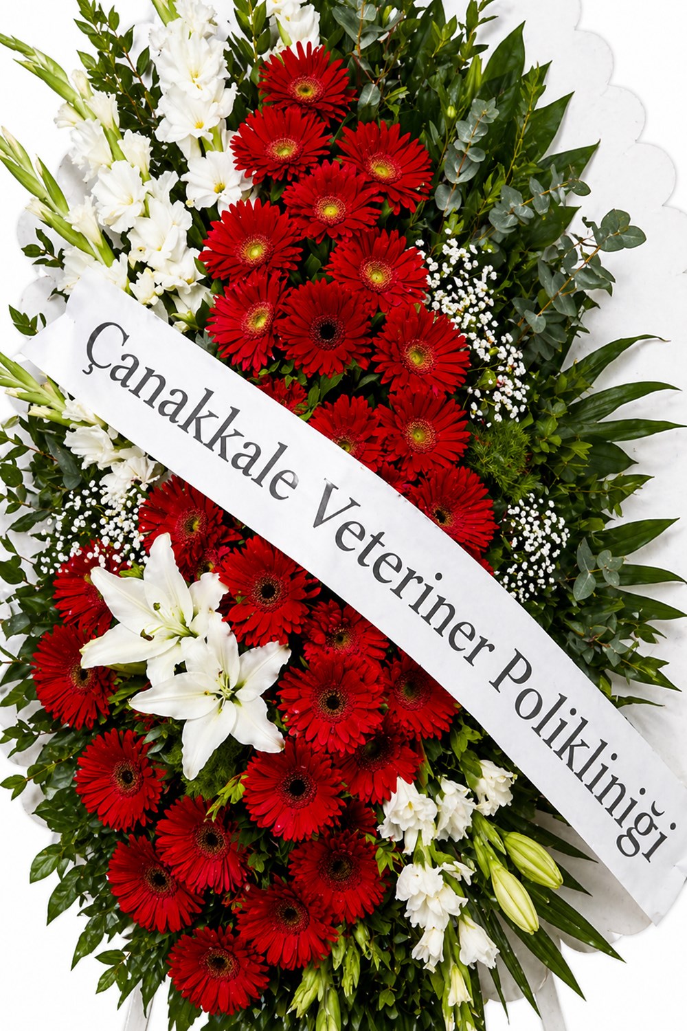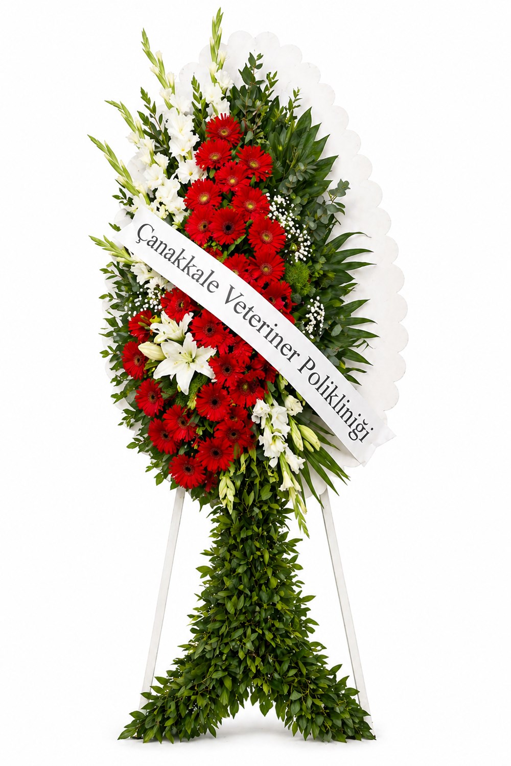 Çanakkale’de prestijli iş yeri açılışları ve özel organizasyonlar için tasarlanan bu VIP çelenk modeli; kırmızı gerberalar, beyaz lilyumlar, glayöl çiçekleri ve zengin yeşil dokular ile hazırlanmıştır.