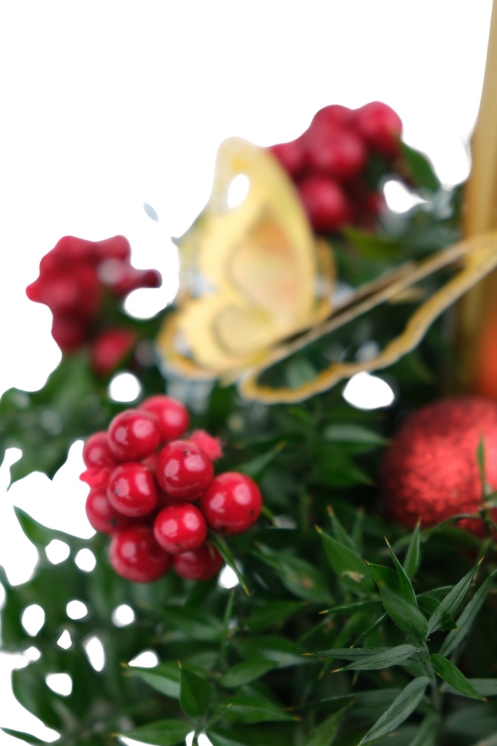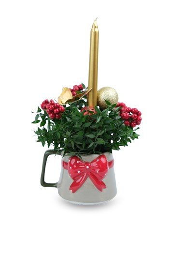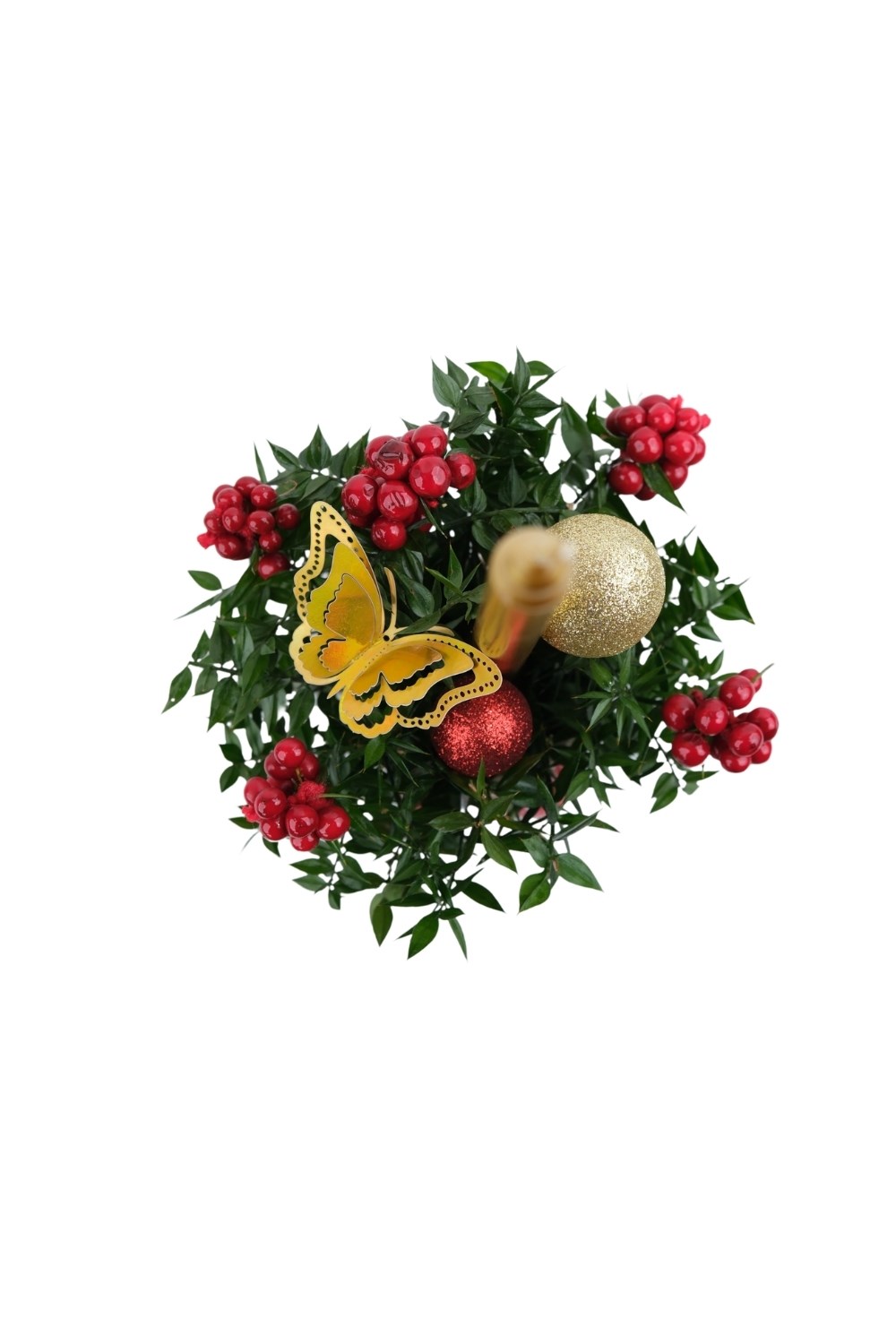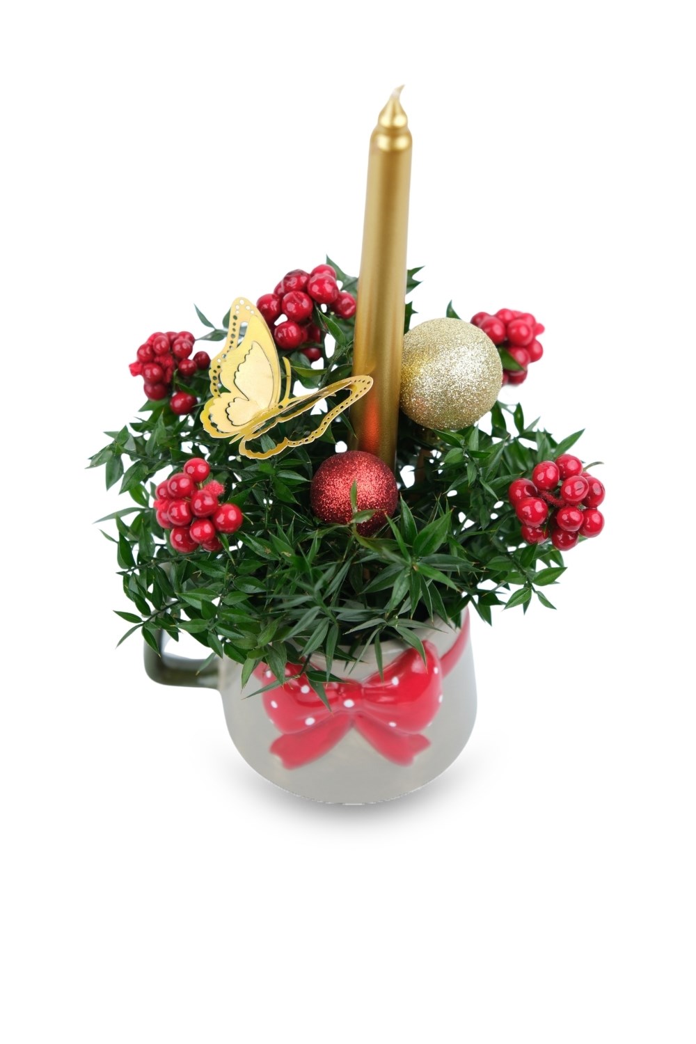 Altın renk mum, yılbaşı süsleri ve mevsime uygun yeşil bitkilerle tasarlanan ürün, bulunduğu ortama şık ve samimi bir hava katar.