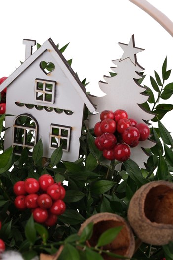 Doğal yeşillikler, kokina dalları, pamuk detayları ve yılbaşı figürleri ile hazırlanan dekoratif yılbaşı sepeti.